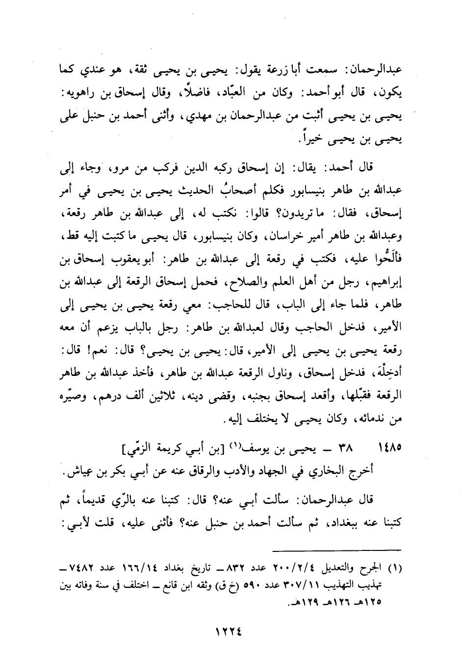 1485 - يحيى بن يُوسُف بن أبي كَرِيمَة الزمي أخرج البُخَارِيّ فِي الْجِهَاد وَالْأَدب والرقاق عَنهُ عَن أبي بكر بن عَيَّاش قَالَ عبد الرَّحْمَن سَأَلت أبي عَنهُ قَالَ كتبنَا عَنهُ بِالريِّ قَدِيما ثمَّ كتبنَا عَنهُ بِبَغْدَاد ثمَّ سَأَلت أَحْمد بن حَنْبَل عَنهُ فَأثْنى عَلَيْهِ قلت لأبي مَا قَوْلك فِيهِ قَالَ هُوَ عِنْدِي صَدُوق وَسُئِلَ عَنهُ أَبُو زرْعَة فَقَالَ هُوَ ثِقَة من قَرْيَة بخراسان يُقَال لَهَا زم