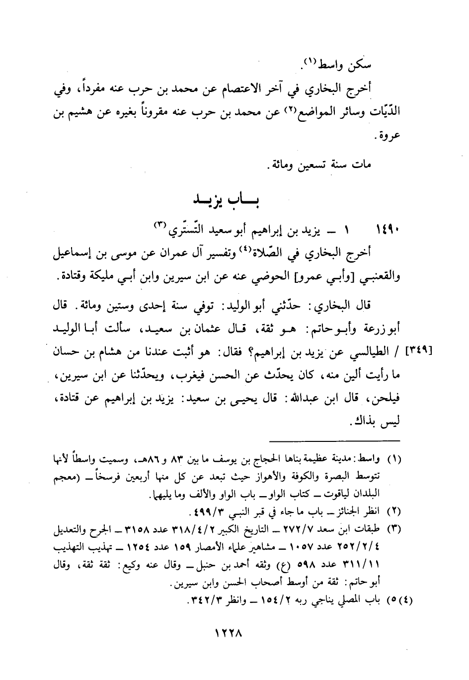 1490 - يزِيد بن إِبْرَاهِيم أَبُو سعيد التسترِي أخرج البُخَارِيّ فِي الصَّلَاة وَتَفْسِير آل عمرَان عَن مُوسَى بن إِسْمَاعِيل والقعنبي وَأبي عَمْرو الحوضي عَنهُ عَن بن سِيرِين وَابْن أبي مليكَة وَقَتَادَة قَالَ البُخَارِيّ حَدثنِي أَبُو الْوَلِيد توفّي سنة إِحْدَى وَسِتِّينَ وَمِائَة قَالَ أَبُو زرْعَة وَأَبُو حَاتِم هُوَ ثِقَة قَالَ عُثْمَان بن سعيد سَأَلت أَبَا الْوَلِيد الطَّيَالِسِيّ عَن يزِيد بن إِبْرَاهِيم فَقَالَ هُوَ أثبت عندنَا من هِشَام بن حسان مَا رَأَيْت أَلين مِنْهُ كَانَ يحدث عَن الْحسن فيغرب ويحدثنا عَن بن سِيرِين فيلحن قَالَ بن عبد الله قَالَ يحيى بن سعيد يزِيد بن إِبْرَاهِيم عَن قَتَادَة لَيْسَ بِذَاكَ
