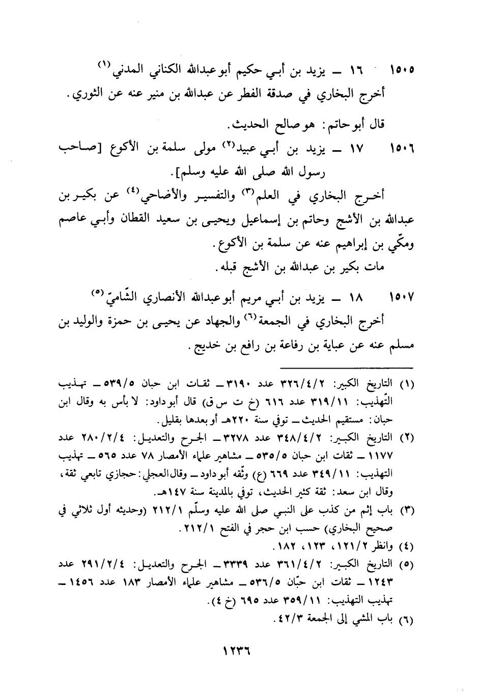 1506 - يزِيد بن أبي عبيد مولى سَلمَة بن الْأَكْوَع صَاحب رَسُول الله صلى الله عَلَيْهِ وَسلم أخرج البُخَارِيّ فِي الْعلم وَالتَّفْسِير وَالْأَضَاحِي عَن بكير بن عبد الله بن الْأَشَج وحاتم بن إِسْمَاعِيل وَيحيى بن سعيد الْقطَّان وَأبي عَاصِم ومكي بن إِبْرَاهِيم عَنهُ عَن سَلمَة بن الْأَكْوَع مَاتَ بكير بن عبد الله بن الْأَشَج قبله
