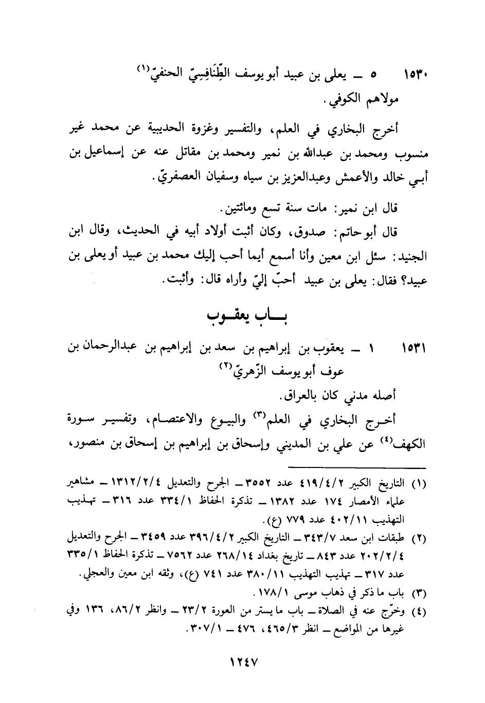 1531 - يَعْقُوب بن إِبْرَاهِيم بن سعد بن إِبْرَاهِيم بن عبد الرَّحْمَن بن عَوْف أَبُو يُوسُف الزُّهْرِيّ أَصله مدنِي كَانَ بالعراق أخرج البُخَارِيّ فِي الْعلم والبيوع والاعتصام وَتَفْسِير سُورَة الْكَهْف عَن عَليّ بن الْمَدِينِيّ وَإِسْحَاق بن إِبْرَاهِيم بن إِسْحَاق بن مَنْصُور وَمُحَمّد بن عُزَيْر وَمُحَمّد بن عبد الرَّحِيم وَابْن أَخِيه عبيد الله بن سعد بن إِبْرَاهِيم عَنهُ وَأخرج فِي غَزْوَة الْحُدَيْبِيَة عَن إِسْحَاق غير مَنْسُوب عَنهُ عَن أَبِيه وَابْن أخي الزُّهْرِيّ قَالَ البُخَارِيّ حَدثنِي عبيد الله بن سعد قَالَ مَاتَ يَعْقُوب بالعراق سنة ثَمَان وَمِائَتَيْنِ قَالَ أَبُو حَاتِم هُوَ صَدُوق وَقَالَ بن سعد توفّي بقم الصُّلْح فِي شَوَّال سنة ثَمَان وَمِائَتَيْنِ