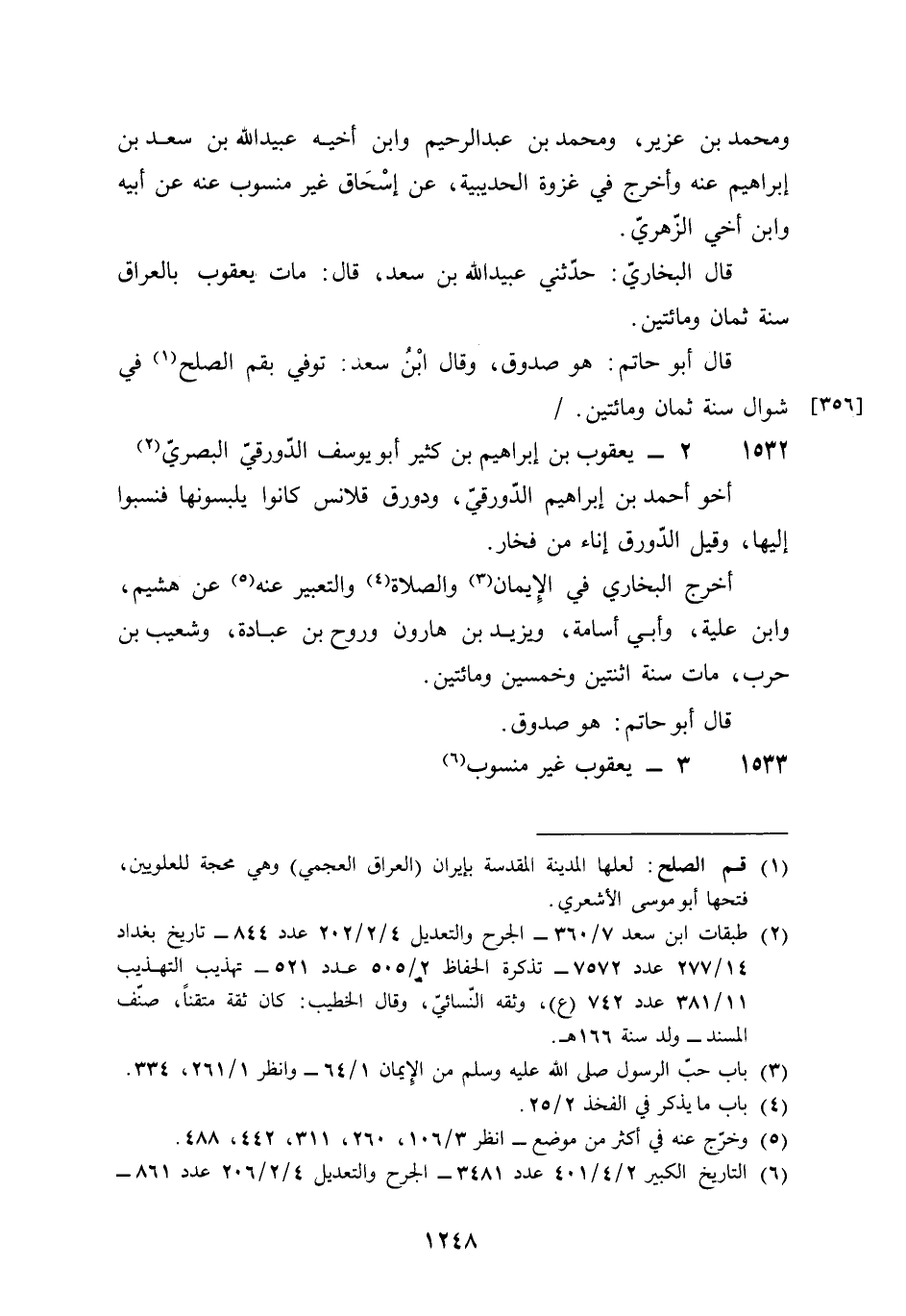 1532 - يَعْقُوب بن إِبْرَاهِيم بن كثير أَبُو يُوسُف الدَّوْرَقِي الْبَصْرِيّ أَخُو أَحْمد بن إِبْرَاهِيم الدَّوْرَقِي ودورق قلانس كَانُوا يلبسونها فنسبوا إِلَيْهَا وَقيل الدورق إِنَاء من فخار أخرج البُخَارِيّ فِي الْإِيمَان وَالصَّلَاة وَالتَّعْبِير عَنهُ عَن هشيم وَابْن علية وَأبي أُسَامَة وَيزِيد بن هَارُون وروح بن عبَادَة وَشُعَيْب بن حَرْب مَاتَ سنة اثْنَتَيْنِ وَخمسين وَمِائَتَيْنِ قَالَ أَبُو حَاتِم هُوَ صَدُوق
