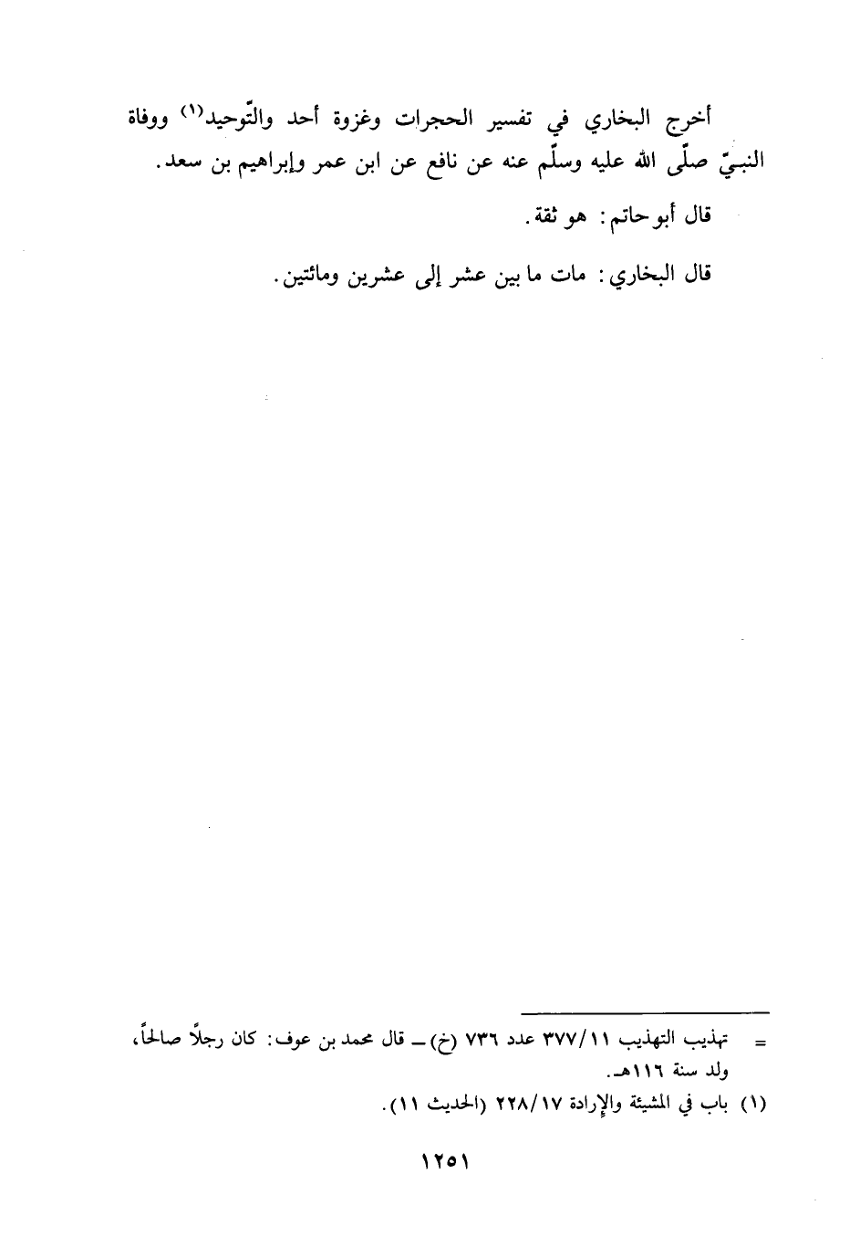 أخرج البُخَارِيّ فِي تَفْسِير الحجرات وغزوة أحد والتوحدي ووفاة النَّبِي صلى الله عَلَيْهِ وَسلم عَنهُ عَن نَافِع عَن بن عمر وَإِبْرَاهِيم بن سعد قَالَ أَبُو حَاتِم هُوَ ثِقَة قَالَ البُخَارِيّ مَاتَ مَا بَين عشر إِلَى عشْرين وَمِائَتَيْنِ