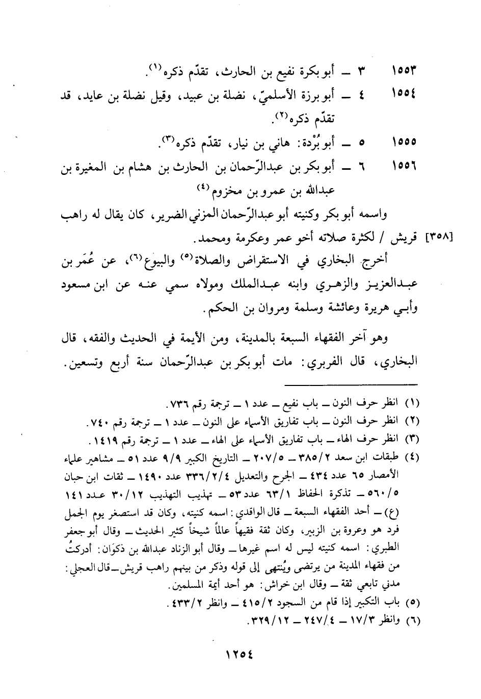 1556 - أَبُو بكر بن عبد الرَّحْمَن بن الْحَارِث بن هِشَام بن الْمُغيرَة بن عبد الله بن عَمْرو بن مَخْزُوم واسْمه أَبُو بكر وكنيته أَبُو عبد الرَّحْمَن الْمُزنِيّ الضَّرِير كَمَا يُقَال لَهُ رَاهِب قُرَيْش لِكَثْرَة صلَاته أَخُو عمر وَعِكْرِمَة وَمُحَمّد أخرج البُخَارِيّ فِي الإستقراض وَالصَّلَاة والبيوع عَن عمر بن عبد الْعَزِيز وَالزهْرِيّ وَابْنه عبد الْملك ومولاه سمي عَنهُ عَن بن مَسْعُود وَأبي هُرَيْرَة وَعَائِشَة وَسَلَمَة ومروان بن الحكم وَهُوَ آخر الْفُقَهَاء السَّبْعَة بِالْمَدِينَةِ وَمن الأيمة فِي الحَدِيث وَالْفِقْه قَالَ البُخَارِيّ قَالَ الْفربرِي مَاتَ أَبُو بكر بن عبد الرَّحْمَن سنة أَربع وَتِسْعين وَقَالَهُ عمر بن عَليّ وَابْن نمير قَالَ أَبُو بكر بن خَيْثَمَة سَمِعت مُصعب بن عبد الله يَقُول كَانَ لأبي بكر بن عبد الرَّحْمَن بن الْحَارِث بن هِشَام منزلَة عِنْد عبد الْملك بن مَرْوَان وَأوصى بِهِ ابْنه الْوَلِيد حِين حَضرته الْوَفَاة وَقَالَ يَا بني إِن لي صديقين فاحفظني فيهمَا عبد الله بن جَعْفَر وَأَبا بكر بن عبد الرَّحْمَن وَأم أبي بكر الشريدة فأخته بنت عتبَة بن سهل بن عَمْرو بن عبد شمس بن عبد ود بن قطر بن مَالك بن حَنْبَل بن غَالب بن لؤَي وإخوة أبي بكر لِأَبِيهِ وَأمه عمر وَعُثْمَان وَعِكْرِمَة وَمُحَمّد بَنو عبد الرَّحْمَن وَمُحَمّد كَانَ يكني أَبَا عبد الرَّحْمَن وَعبد الرَّحْمَن بن الْحَارِث يُقَال لَهُ الشريد أُتِي بِهِ من الشَّام وبفاخته ابْنة عتبَة وَلم يكن بَقِي من ولد سُهَيْل غَيرهمَا فسماهما عمر بن الْخطاب بالشريدين وَقَالَ عمر زوجوا الشريد الشريدة فزوج عبد الرَّحْمَن فَاخِتَة فأقطعهما عمر بن الْخطاب بِالْمَدِينَةِ خطة فأوسع لَهما فَقيل لَهُ أوسعت لَهما يَا أَمِير الْمُؤمنِينَ فَقَالَ لَعَلَّ الله أَن ينشر مِنْهُمَا فنشر الله مِنْهُمَا ولدا كثيرا رجَالًا وَنسَاء وعبد الملك وَعمر والْحَارث بَنو أبي بكر بن عبد الرَّحْمَن رُوِيَ عَنْهُم الحَدِيث قَالَ أَبُو بكر حَدثنَا مُوسَى بن إِسْمَاعِيل حَدثنَا وهيب بن خَالِد عَن دَاوُد بن أبي هِنْد عَن عَامر الشّعبِيّ عَن عمر بن عبد الرَّحْمَن أَن أَخَاهُ أَبَا بكر بن عبد الرَّحْمَن كَانَ يَصُوم الدَّهْر لَا يفْطر