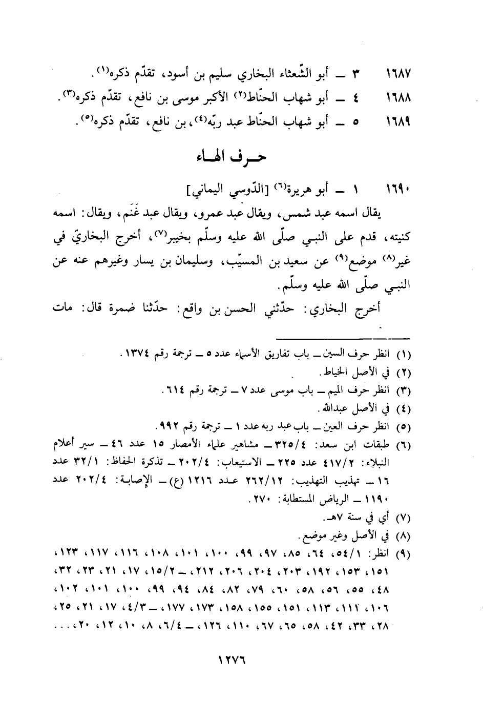 1690 - أَبُو هُرَيْرَة الدوسي الْيَمَانِيّ يُقَال اسْمه عبد شمس وَيُقَال عبد عَمْرو وَيُقَال عبد غنم وَيُقَال اسْمه كنيته قدم على النَّبِي صلى الله عَلَيْهِ وَسلم بِخَيْبَر أخرج البُخَارِيّ فِي غير مَوضِع عَن سعيد بن الْمسيب وَسليمَان بن يسَار وَغَيرهم عَنهُ عَن النَّبِي صلى الله عَلَيْهِ وَسلم أخرج البُخَارِيّ حَدثنِي الْحسن بن وَاقع حَدثنَا ضَمرَة قَالَ مَاتَ أَبُو هُرَيْرَة سنة ثَمَان وَخمسين وَقَالَ أَحْمد بن عَليّ بن مُسلم حَدثنَا أَبُو عمر القرمطي حَدثنِي مُحَمَّد بن مسلمة حَدثنَا إِبْرَاهِيم بن الْفضل المَخْزُومِي قَالَ كَانَ اسْم أبي هُرَيْرَة فِي الْجَاهِلِيَّة عبد شمس وكنيته أَبُو الْأسد فَسَماهُ رَسُول الله صلى الله عَلَيْهِ وَسلم عبد الله وكناه أَبَا هُرَيْرَة قَالَ عَمْرو بن عَليّ مَاتَ أَبُو هُرَيْرَة سنة تسع وَخمسين