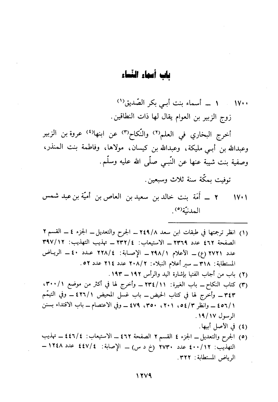 1700 - أَسمَاء بنت أبي بكر الصّديق زوج الزبير بن الْعَوام يُقَال لَهَا ذَات النطاقين أخرج البُخَارِيّ فِي الْعلم وَالنِّكَاح عَن ابْنهَا عُرْوَة بن الزبير وَعبد الله بن أبي مليكَة وَعبد الله بن كيسَان مَوْلَاهَا وَفَاطِمَة بنت الْمُنْذر وَصفِيَّة بنت شيبَة عَنْهَا عَن النَّبِي صلى الله عَلَيْهِ وَسلم توفيت بِمَكَّة سنة ثَلَاث وَسبعين