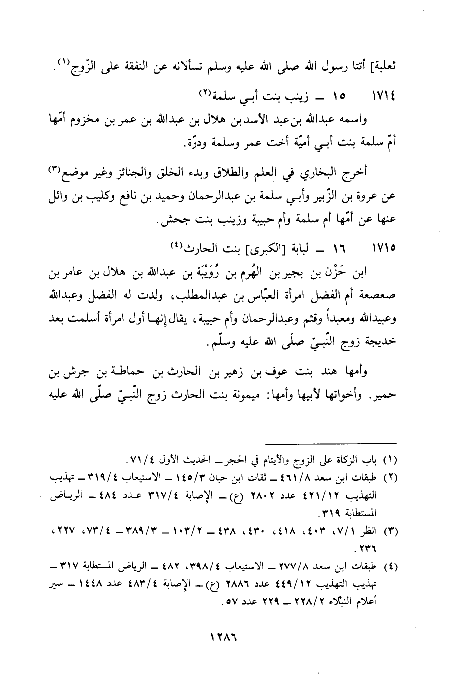 1714 - زَيْنَب بنت أبي سَلمَة واسْمه عبد الله بن عبد الْأسد بن هِلَال بن عبد الله بن عمر بن مَخْزُوم أمهَا أم سَلمَة بنت أبي أُميَّة أُخْت عمر وَسَلَمَة ودرة أخرج البُخَارِيّ فِي الْعلم وَالطَّلَاق وبدء الْخلق والجنائز وَغير مَوضِع عَن عُرْوَة بن الزبير وَأبي سَلمَة بن عبد الرَّحْمَن وَحميد بن نَافِع وكليب بن وَائِل عَنْهَا عَن أمهَا أم سَلمَة وَأم حَبِيبَة وَزَيْنَب بنت جحش