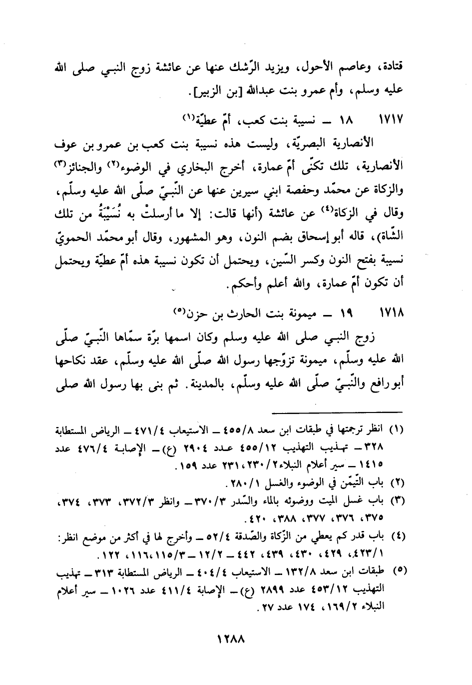 1717 - نسيبة بنت كَعْب أم عَطِيَّة الْأَنْصَارِيَّة البصرية وَلَيْسَت هَذِه نسيبة بنت كَعْب بن عَمْرو بن عَوْف الْأَنْصَارِيَّة تِلْكَ تكنى أم عمَارَة أخرج البُخَارِيّ فِي الْوضُوء والجنائز وَالزَّكَاة عَن مُحَمَّد وَحَفْصَة ابْني سِيرِين عَنْهَا عَن النَّبِي صلى الله عَلَيْهِ وَسلم وَقَالَ فِي الزَّكَاة عَن عَائِشَة أَنَّهَا قَالَت إِلَّا مَا أرْسلت بِهِ نسيبة من تِلْكَ الشَّاة قَالَه أَبُو إِسْحَاق بِضَم النُّون وَهُوَ الْمَشْهُور وَقَالَ أَبُو مُحَمَّد الْحَمَوِيّ نسيبة بِفَتْح النُّون وَكسر السِّين وَيحْتَمل أَن تكون نسيبة هَذِه أم عَطِيَّة وَيحْتَمل أَن تكون أم عمَارَة وَالله أعلم وَأحكم