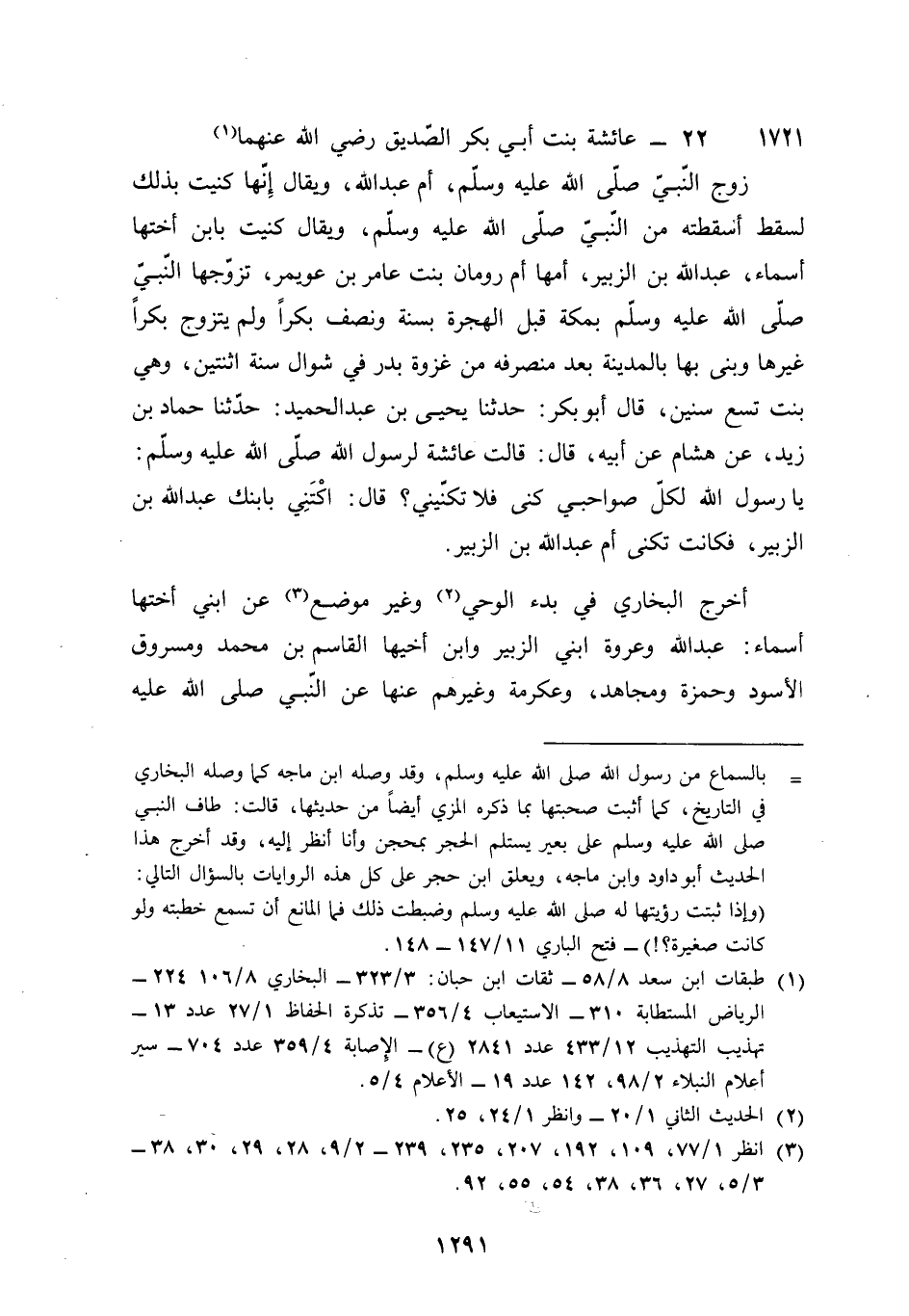 1721 - عَائِشَة بنت أبي بكر الصّديق رَضِي الله عَنْهُمَا زوج النَّبِي صلى الله عَلَيْهِ وَسلم أم عبد الله وَيُقَال إِنَّهَا كنيت بذلك لسقط أسقطته من النَّبِي صلى الله عَلَيْهِ وَسلم وَيُقَال كنيت بِابْن أُخْتهَا أَسمَاء عبد الله بن الزبير أمهَا أم رُومَان بنت عَامر بن عُوَيْمِر تزَوجهَا النَّبِي صلى الله عَلَيْهِ وَسلم بِمَكَّة قبل الْهِجْرَة بِسنة وَنصف بكرا وَلم يتَزَوَّج بكرا غَيرهَا وَبنى بهَا بِالْمَدِينَةِ بعد مُنْصَرفه من غَزْوَة بدر فِي شَوَّال سنة اثْنَتَيْنِ وَهِي بنت تسع سِنِين قَالَ أَبُو بكر حَدثنَا يحيى بن عبد الحميد حَدثنَا حَمَّاد بن زيد عَن هِشَام عَن أَبِيه قَالَ قَالَت عَائِشَة لرَسُول الله صلى الله عَلَيْهِ وَسلم يَا رَسُول الله لكل صواحبي كنى فَلَا تكنيني قَالَ اكتني بابنك عبد الله بن الزبير فَكَانَت تكنى أم عبد الله بن الزبير أخرج البُخَارِيّ فِي بَدْء الْوَحْي وَغير مَوضِع عَن ابْني أُخْتهَا أَسمَاء عبد الله وَعُرْوَة ابْني الزبير وَابْن أَخِيهَا الْقَاسِم بن مُحَمَّد ومسروق الْأسود وَحَمْزَة وَمُجاهد وَعِكْرِمَة وَغَيرهم عَنْهَا عَن النَّبِي صلى الله عَلَيْهِ وَسلم مَاتَت لَيْلَة الثُّلَاثَاء لسبع عشرَة خلت لشهر رَمَضَان سنة ثَمَان وَخمسين بعد الْوتر ودفنت فِي لَيْلَتهَا