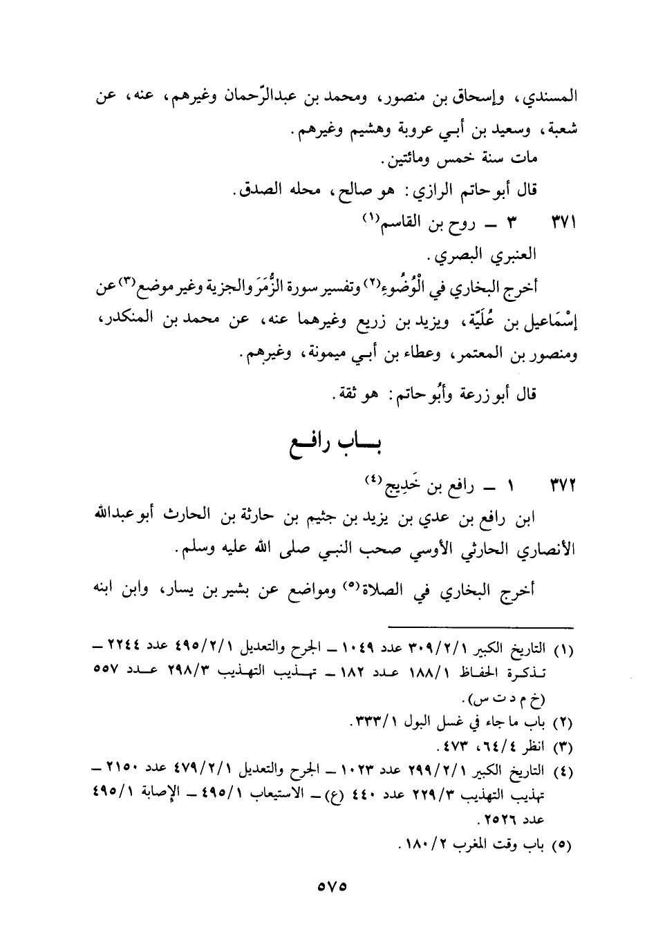 371 - روح بن الْقَاسِم الْعَنْبَري الْبَصْرِيّ أخرج البُخَارِيّ فِي الْوضُوء وَتَفْسِير سُورَة الزمر والجزية وَغير مَوضِع عَن إِسْمَاعِيل بن علية وَيزِيد بن زُرَيْع وَغَيرهمَا عَنهُ عَن مُحَمَّد بن الْمُنْكَدر وَمَنْصُور بن الْمُعْتَمِر وَعَطَاء بن أبي مَيْمُونَة وَغَيرهم قَالَ أَبُو زرْعَة وَأَبُو حَاتِم هُوَ ثِقَة