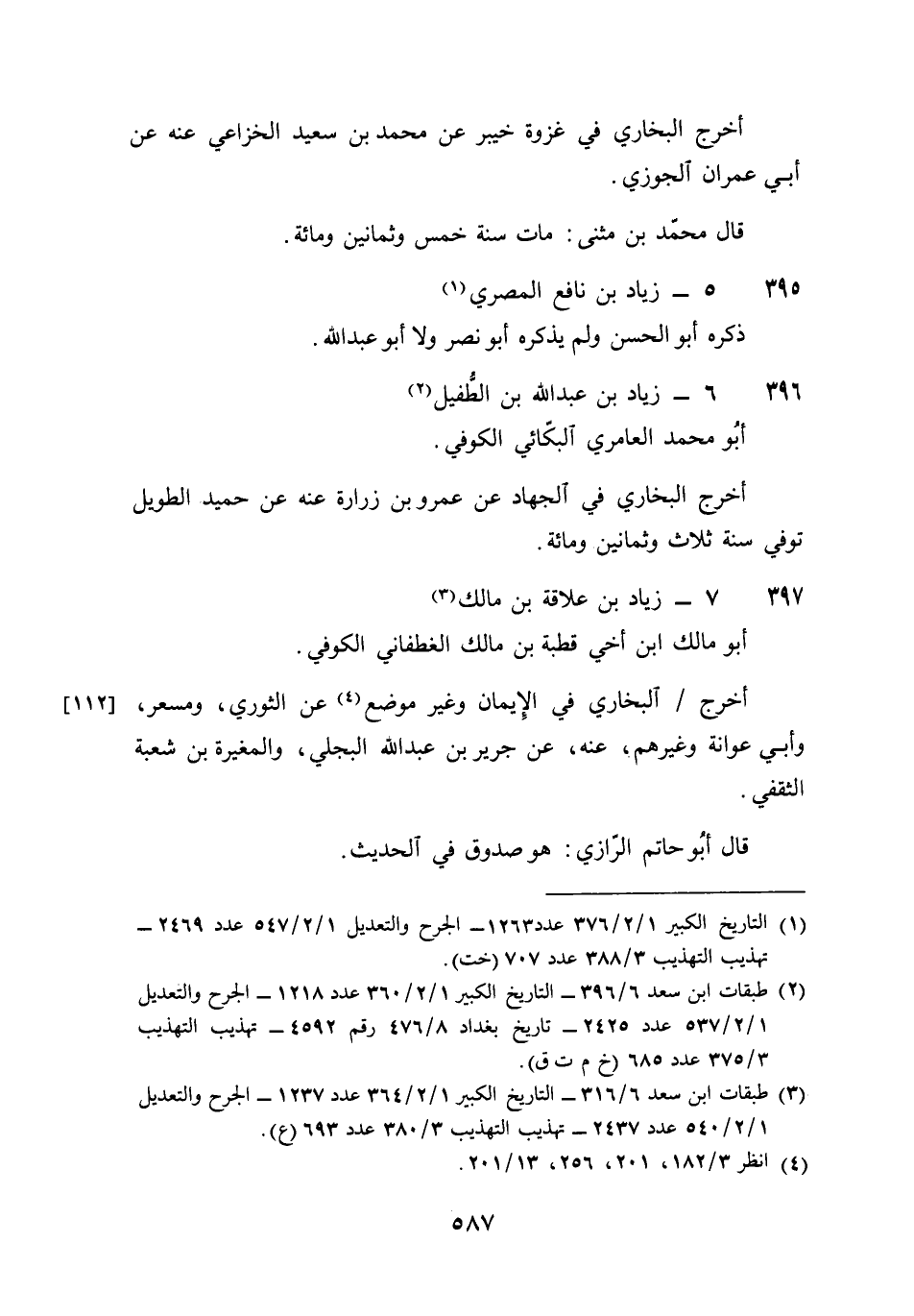 397 - زِيَاد بن علاقَة بن مَالك أَبُو مَالك بن أخي قُطْبَة بن مَالك الْغَطَفَانِي الْكُوفِي أخرج البُخَارِيّ فِي الْإِيمَان وَغير مَوضِع عَن الثَّوْريّ ومسعر وَأبي عوَانَة وَغَيرهم عَنهُ عَن جرير بن عبد الله البَجلِيّ والمغيرة بن شُعْبَة الثَّقَفِيّ قَالَ أَبُو حَاتِم الرَّازِيّ هُوَ صَدُوق فِي الحَدِيث