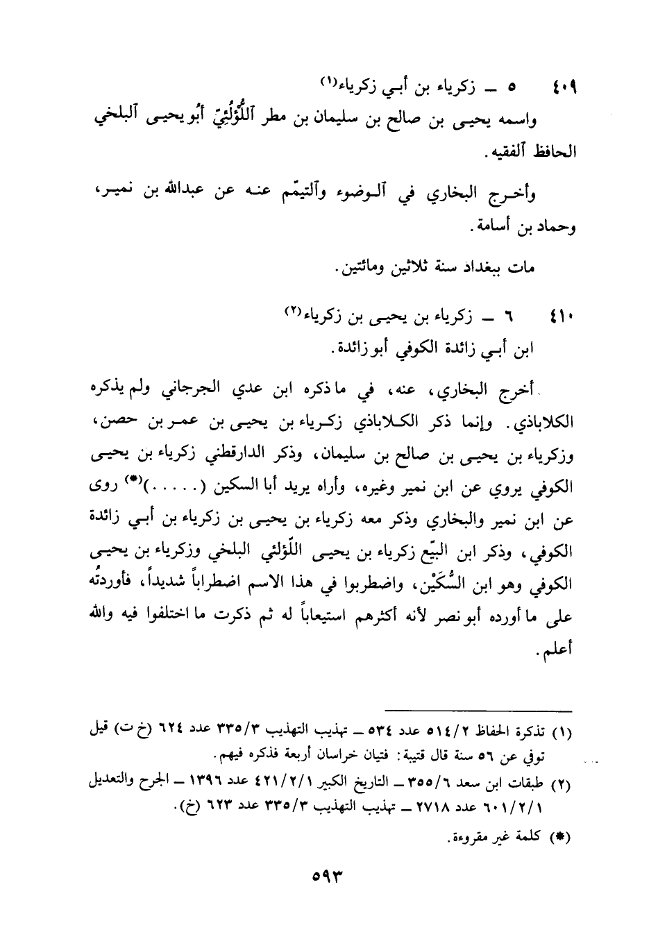 410 - زَكَرِيَّا بن يحيى بن زَكَرِيَّا بن أبي زَائِدَة الْكُوفِي أَبُو زَائِدَة أخرج البُخَارِيّ عَنهُ فِي مَا ذكره بن عدي الْجِرْجَانِيّ وَلم يذكرهُ الكلاباذي وَإِنَّمَا ذكر الكلاباذي زَكَرِيَّا بن يحيى بن عمر بن حصن وزكرياء بن يحيى بن صَالح بن سُلَيْمَان وَذكر الدَّارَقُطْنِيّ زَكَرِيَّا بن يحيى الْكُوفِي يروي عَن بن نمير وَغَيره وَأرَاهُ يُرِيد أَبَا السكين روى عَن بن نمير وَالْبُخَارِيّ وَذكر مَعَه زَكَرِيَّا بن يحيى بن زَكَرِيَّا بن أبي زَائِدَة الْكُوفِي وَذكر بن البيع زَكَرِيَّا بن يحيى اللؤلئي الْبَلْخِي وزكرياء بن يحيى الْكُوفِي وَهُوَ بن السكين واضطربوا فِي هَذَا الِاسْم اضطرابا شَدِيدا فأوردته على مَا أوردهُ أَبُو نصر لِأَنَّهُ أَكْثَرهم استيعابا لَهُ ثمَّ ذكرت مَا اخْتلفُوا فِيهِ وَالله أعلم