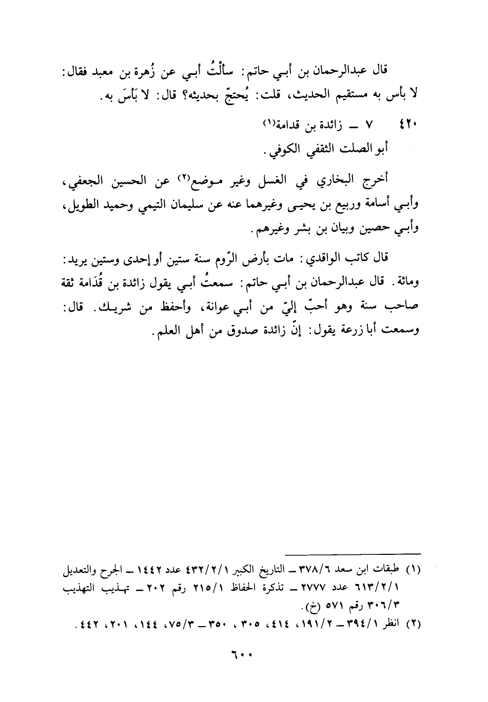 420 - زَائِدَة بن قدامَة أَبُو الصَّلْت الثَّقَفِيّ الْكُوفِي أخرج البُخَارِيّ فِي الْغسْل وَغير مَوضِع عَن الْحُسَيْن الْجعْفِيّ وَأبي أُسَامَة وربيع بن يحيى وَغَيرهمَا عَنهُ سُلَيْمَان التَّيْمِيّ وَحميد الطَّوِيل وَأبي حُصَيْن وَبَيَان بن بشر وَغَيرهم قَالَ كَاتب الْوَاقِدِيّ مَاتَ بِأَرْض الرّوم سنة سِتِّينَ أَو إِحْدَى وَسِتِّينَ يُرِيد وَمِائَة قَالَ عبد الرَّحْمَن بن أبي حَاتِم سَمِعت أبي يَقُول زَائِدَة بن قدامَة ثِقَة صَاحب سنة وَهُوَ أحب إِلَيّ من أبي عوَانَة وأحفظ من شريك قَالَ وَسمعت أَبَا زرْعَة يَقُول إِن زَائِدَة صَدُوق من أهل الْعلم