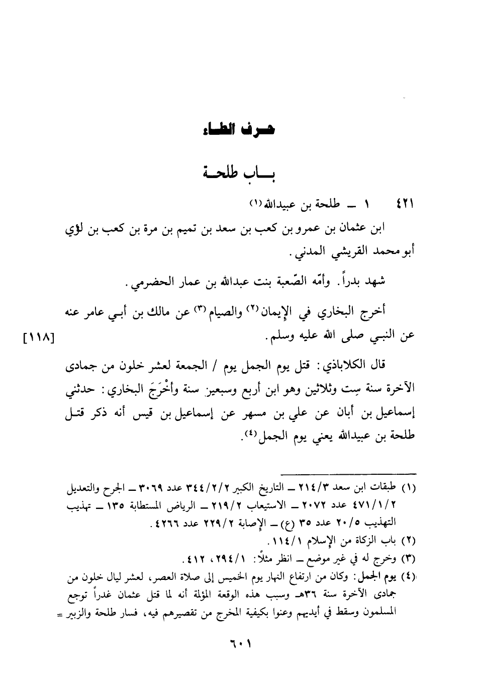 421 - طَلْحَة بن عبيد الله بن عُثْمَان بن عَمْرو بن كَعْب بن سعد بن تَمِيم بن مرّة بن كَعْب بن لؤَي أَبُو مُحَمَّد القريشي الْمدنِي شهد بَدْرًا وَأمه الصعبة بنت عبد الله بن عمار الْحَضْرَمِيّ أخرج البُخَارِيّ فِي الْإِيمَان وَالصِّيَام عَن مَالك بن أبي عَامر عَنهُ عَن النَّبِي صلى الله عَلَيْهِ وَسلم قَالَ الكلاباذي قتل يَوْم الْجمل يَوْم الْجُمُعَة لعشر خلون من جُمَادَى الْآخِرَة سنة سِتّ وَثَلَاثِينَ وَهُوَ بن أَربع وَسبعين سنة وَأخرج البُخَارِيّ حَدثنِي إِسْمَاعِيل بن أبان عَن عَليّ بن مسْهر عَن إِسْمَاعِيل بن قيس أَنه ذكر قتل طَلْحَة بن عبيد الله يَعْنِي يَوْم الْجمل