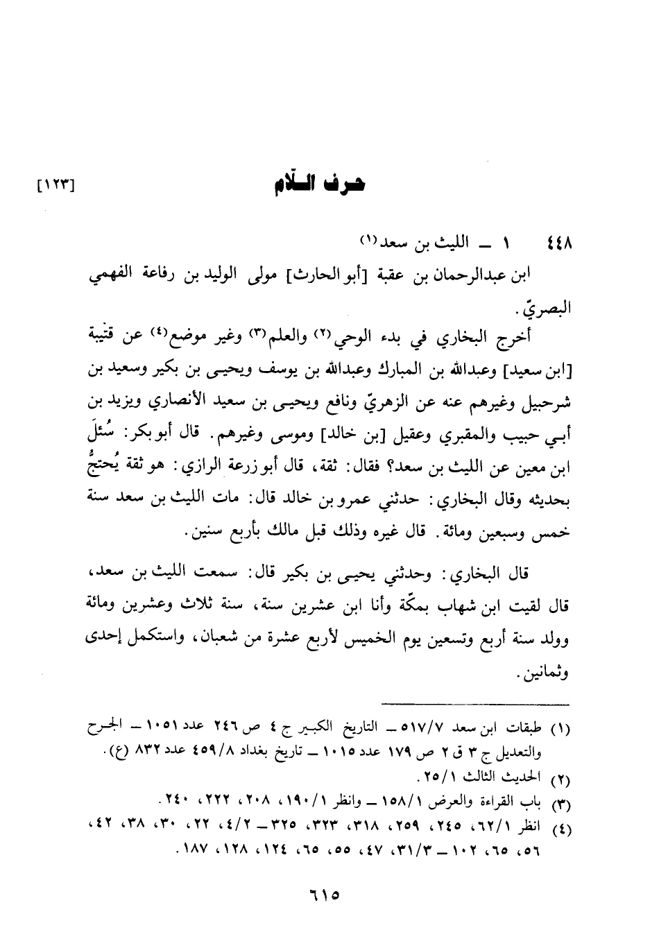 448 - اللَّيْث بن سعد بن عبد الرَّحْمَن بن عقبَة أَبُو الْحَارِث مولى الْوَلِيد بن رِفَاعَة الفهمي الْبَصْرِيّ أخرج البُخَارِيّ فِي بَدْء الْوَحْي وَالْعلم وَغير مَوضِع عَن قُتَيْبَة بن سعيد وَعبد الله بن الْمُبَارك وَعبد الله بن يُوسُف وَيحيى بن بكير وَسَعِيد بن شُرَحْبِيل وَغَيرهم عَنهُ عَن الزُّهْرِيّ وَنَافِع وَيحيى بن سعيد الْأنْصَارِيّ وَيزِيد بن أبي حبيب والمقبري وَعقيل بن خَالِد ومُوسَى وَغَيرهم قَالَ أَبُو بكر سُئِلَ بن معِين عَن اللَّيْث بن سعد فَقَالَ ثِقَة قَالَ أَبُو زرْعَة الرَّازِيّ هُوَ ثِقَة يحْتَج بحَديثه وَقَالَ البُخَارِيّ حَدثنِي عَمْرو بن خَالِد قَالَ مَاتَ اللَّيْث بن سعد سنة خمس وَسبعين وَمِائَة قَالَ غَيره وَذَلِكَ قبل مَالك بِأَرْبَع سِنِين قَالَ البُخَارِيّ وحَدثني يحيى بن بكير قَالَ سَمِعت اللَّيْث بن سعد قَالَ لقِيت بن شهَاب بِمَكَّة وَأَنا بن عشْرين سنة سنة ثَلَاث وَعشْرين وَمِائَة وَولد سنة أَربع وَتِسْعين يَوْم الْخَمِيس لأَرْبَع عشرَة من شعْبَان واستكمل إِحْدَى وَثَمَانِينَ