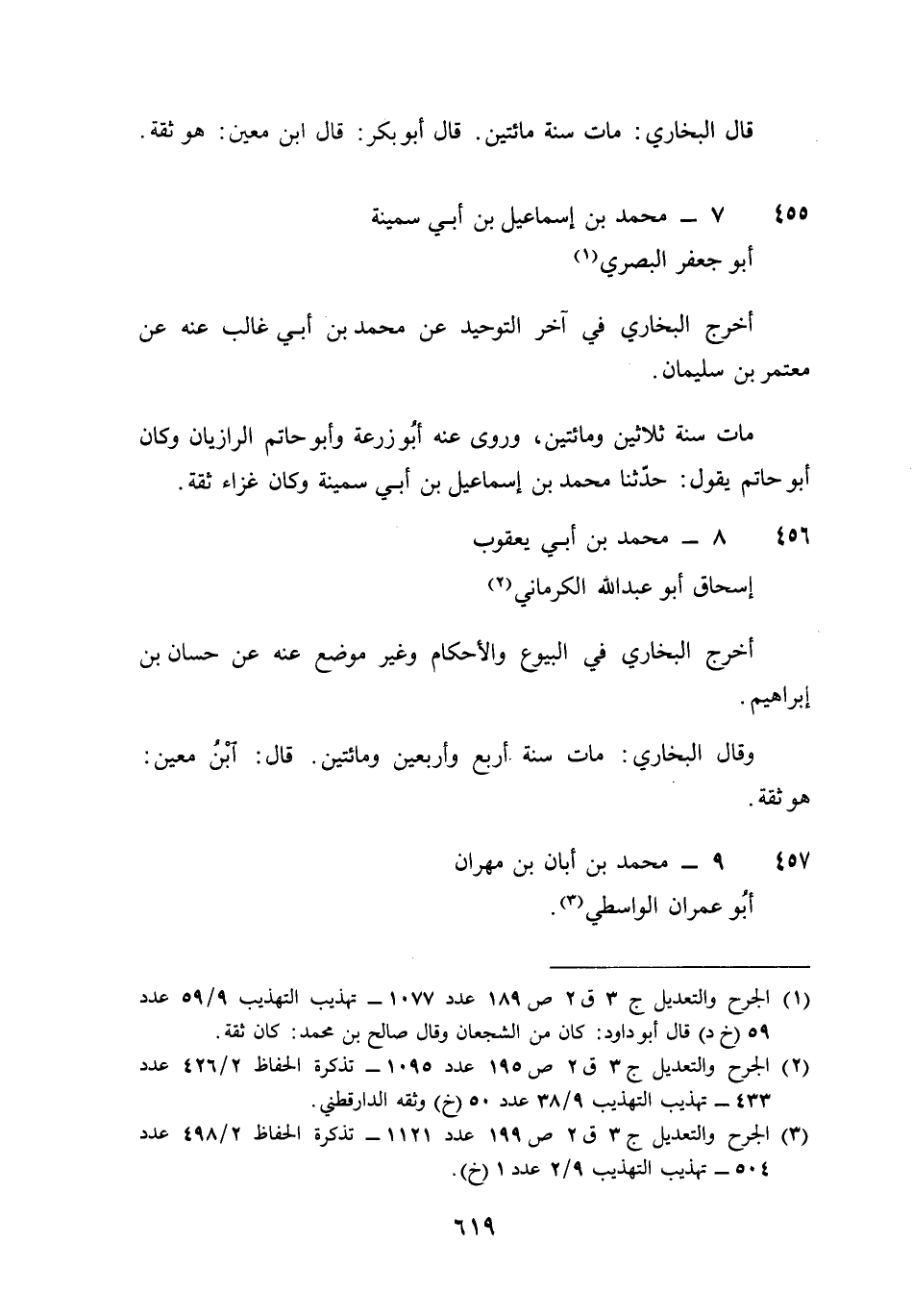 456 - مُحَمَّد بن أبي يَعْقُوب إِسْحَاق أَبُو عبد الله الْكرْمَانِي أخرج البُخَارِيّ فِي الْبيُوع وَالْأَحْكَام وَغير مَوضِع عَنهُ عَن حسان بن إِبْرَاهِيم وَقَالَ البُخَارِيّ مَاتَ سنة أَربع وَأَرْبَعين وَمِائَتَيْنِ قَالَ بن معِين هُوَ ثِقَة