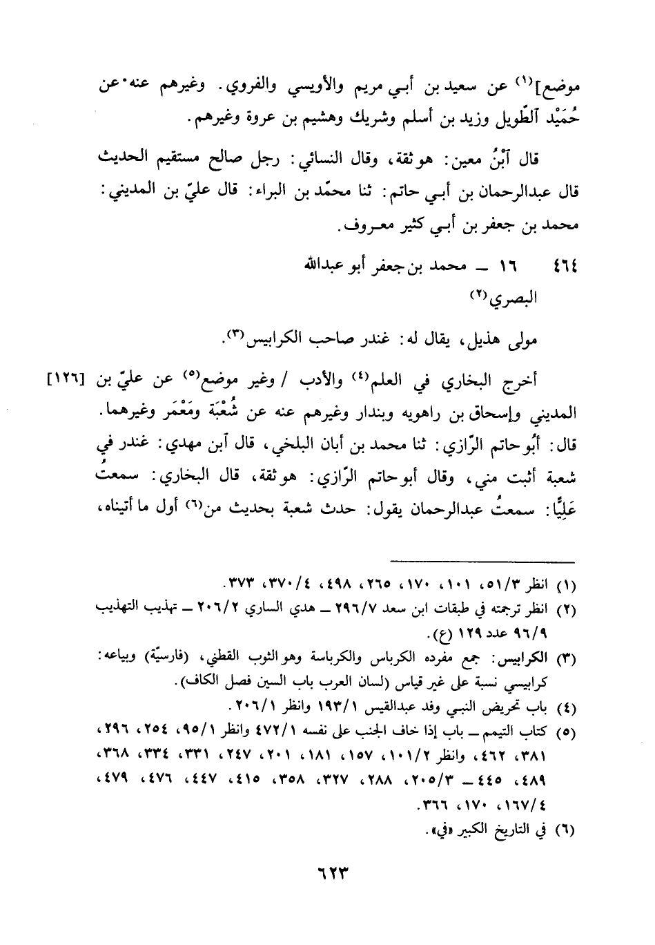 464 - مُحَمَّد بن جَعْفَر أَبُو عبد الله الْبَصْرِيّ مولى هُذَيْل يُقَال لَهُ غنْدر صَاحب الكرابيس أخرج البُخَارِيّ فِي الْعلم وَالْأَدب وَغير مَوضِع عَن عَليّ بن الْمَدِينِيّ وَإِسْحَاق بن رَاهَوَيْه وَبُنْدَار وَغَيرهم عَنهُ عَن شُعْبَة وَمعمر وَغَيرهمَا قَالَ أَبُو حَاتِم الرَّازِيّ ثَنَا مُحَمَّد بن أبان الْبَلْخِي قَالَ بن مهْدي غنْدر فِي شُعْبَة أثبت مني وَقَالَ أَبُو حَاتِم الرَّازِيّ هُوَ ثِقَة قَالَ البُخَارِيّ سَمِعت عليا سَمِعت عبد الرَّحْمَن يَقُول حدث شُعْبَة بِحَدِيث من أول مَا أتيناه فَتَطلع غنْدر ليستفهمه فَقَالَ فقدتك تسمع علمي كُله وَهُوَ يستفهمني وَكَانَ عبد الرَّحْمَن يحثنا على غنْدر وَيَقُول لَوَدِدْت أَنِّي كتبت كتبه وَكُنَّا نستفيد من كتب غنْدر فِي حَيَاة شُعْبَة قَالَ البُخَارِيّ قَالَ عَليّ قَالَ وَكِيع مَا فعل الصَّحِيح الْكتاب يَعْنِي غندرا وَقَالَ عَليّ وَهُوَ أحب إِلَيّ من عبد الرَّحْمَن فِي شُعْبَة وجالس شُعْبَة نَحوا من عشْرين سنة قَالَ البُخَارِيّ حَدثنِي مُحَمَّد بن الْمثنى قَالَ مَاتَ غنْدر سنة ثِنْتَيْنِ وَتِسْعين قَالَ أَبُو حَفْص الفلاس سَمِعت عَبْدَانِ يَقُول سَمِعت عَمْرو بن الْعَبَّاس يَقُول كتبت عَن غنْدر حَدِيثه كُله إِلَّا حَدِيثه عَن سعيد بن أبي عرُوبَة فَإِن عبد الرَّحْمَن بن مهْدي نهاني أَن أكتب عَنهُ حَدِيث سعيد بن أبي عرُوبَة وَقَالَ إِن غندرا سمع مِنْهُ بعد الِاخْتِلَاط قَالَ أَبُو أَحْمد فحكيت هَذِه الْحِكَايَة لِابْنِ مكرم بِالْبَصْرَةِ فَقَالَ لي كَيفَ يكون هَذَا وَقد سَمِعت عَمْرو بن عَليّ يَقُول سَمِعت غندرا يَقُول مَا أتيت شُعْبَة حَتَّى فرغت من أبي عرُوبَة وَقَالَ عَليّ بن الْمَدِينِيّ كنت إِذا ذكرت غندرا ليحيى عوج فَمه وَكَانَ يُضعفهُ يُرِيد وَالله أعلم أَنه كَانَ يُضعفهُ فِي سعيد بن أبي عرُوبَة