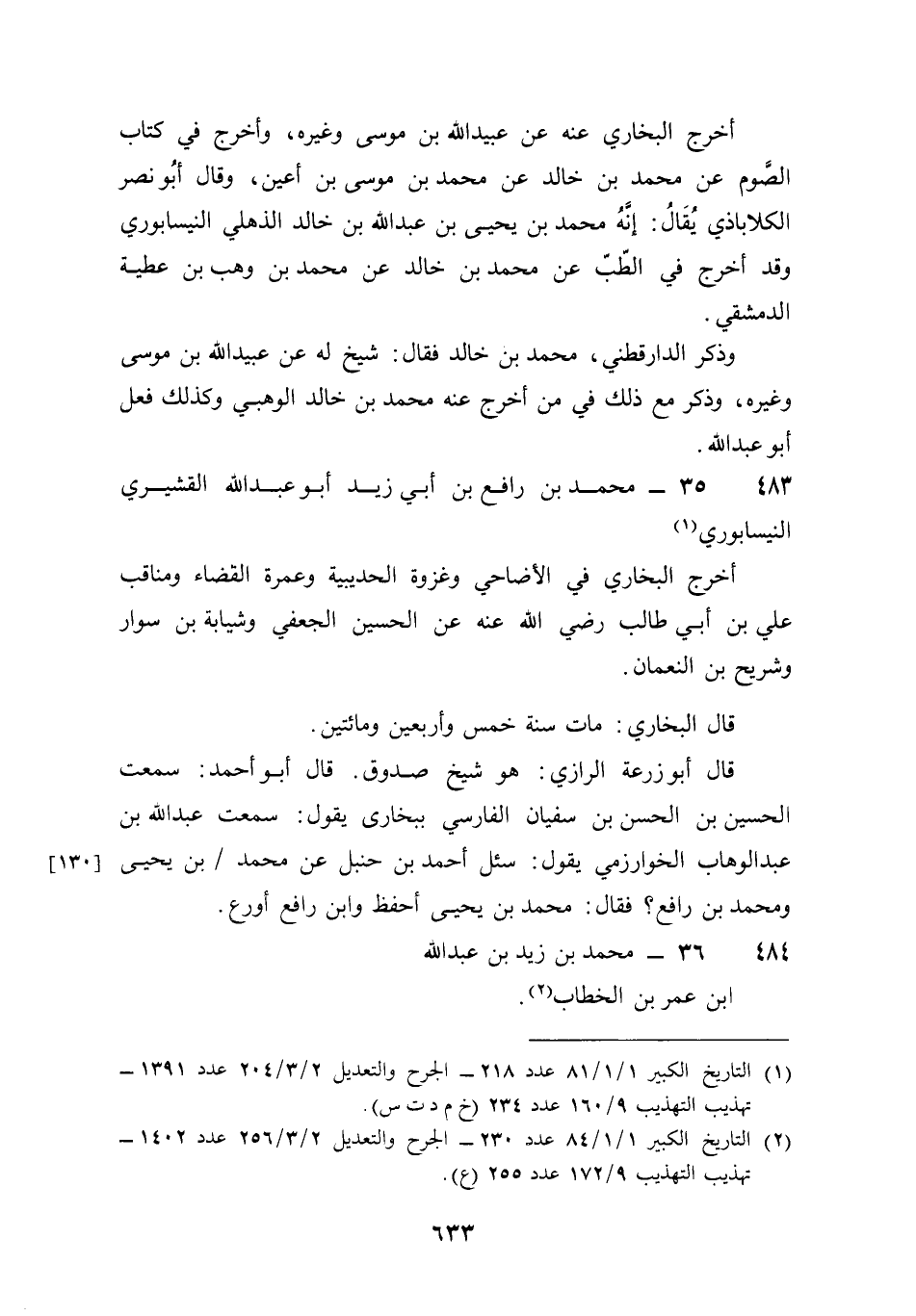 483 - مُحَمَّد بن رَافع بن أبي زيد أَبُو عبد الله الْقشيرِي النَّيْسَابُورِي أخرج البُخَارِيّ فِي الْأَضَاحِي وغزوة الْحُدَيْبِيَة وَعمرَة الْقَضَاء ومناقب عَليّ بن أبي طَالب رَضِي الله عَنهُ عَن الْحُسَيْن الْجعْفِيّ وشيابة بن سوار وَشُرَيْح بن النُّعْمَان قَالَ البُخَارِيّ مَاتَ سنة خمس وَأَرْبَعين وَمِائَتَيْنِ قَالَ أَبُو زرْعَة الرَّازِيّ هُوَ شيخ صَدُوق قَالَ أَبُو أَحْمد سَمِعت الْحُسَيْن بن الْحسن بن سُفْيَان الْفَارِسِي ببخارى يَقُول سَمِعت عبد الله بن عبد الْوَهَّاب الْخَوَارِزْمِيّ يَقُول سُئِلَ أَحْمد بن حَنْبَل عَن مُحَمَّد بن يحيى وَمُحَمّد بن رَافع فَقَالَ مُحَمَّد بن يحيى أحفظ وَابْن رَافع أورع