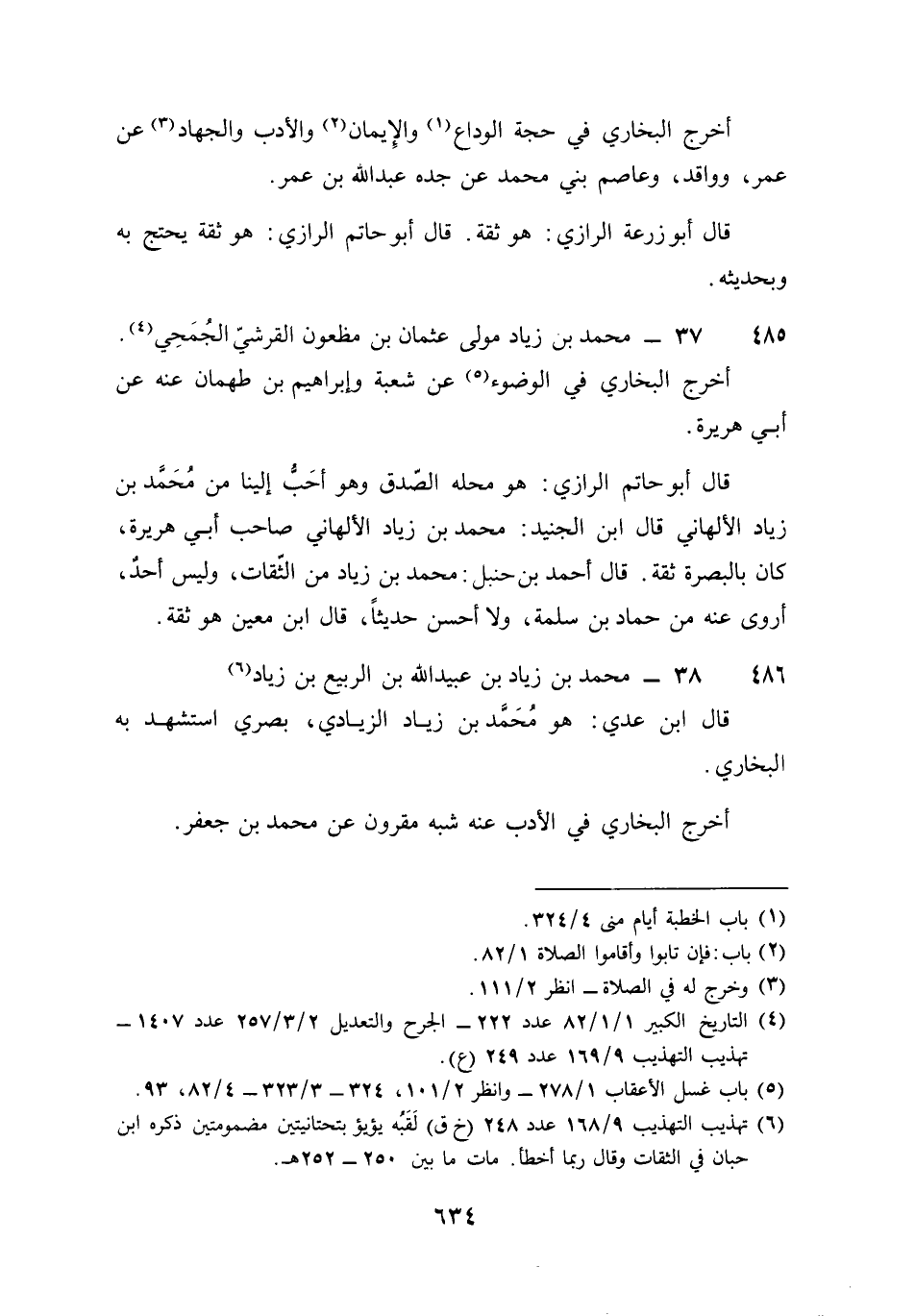485 - مُحَمَّد بن زِيَاد مولى عُثْمَان بن مَظْعُون الْقرشِي الجُمَحِي أخرج البُخَارِيّ فِي الْوضُوء عَن شُعْبَة وَإِبْرَاهِيم بن طهْمَان عَنهُ عَن أبي هُرَيْرَة قَالَ أَبُو حَاتِم الرَّازِيّ هُوَ مَحَله الصدْق وَهُوَ أحب إِلَيْنَا من مُحَمَّد بن زِيَاد الْأَلْهَانِي قَالَ بن الْجُنَيْد مُحَمَّد بن زِيَاد الْأَلْهَانِي صَاحب أبي هُرَيْرَة كَانَ بِالْبَصْرَةِ ثِقَة قَالَ أَحْمد بن حَنْبَل مُحَمَّد بن زِيَاد من الثِّقَات وَلَيْسَ أحد أروى عَنهُ من حَمَّاد بن سَلمَة وَلَا أحسن حَدِيثا قَالَ بن معِين هُوَ ثِقَة