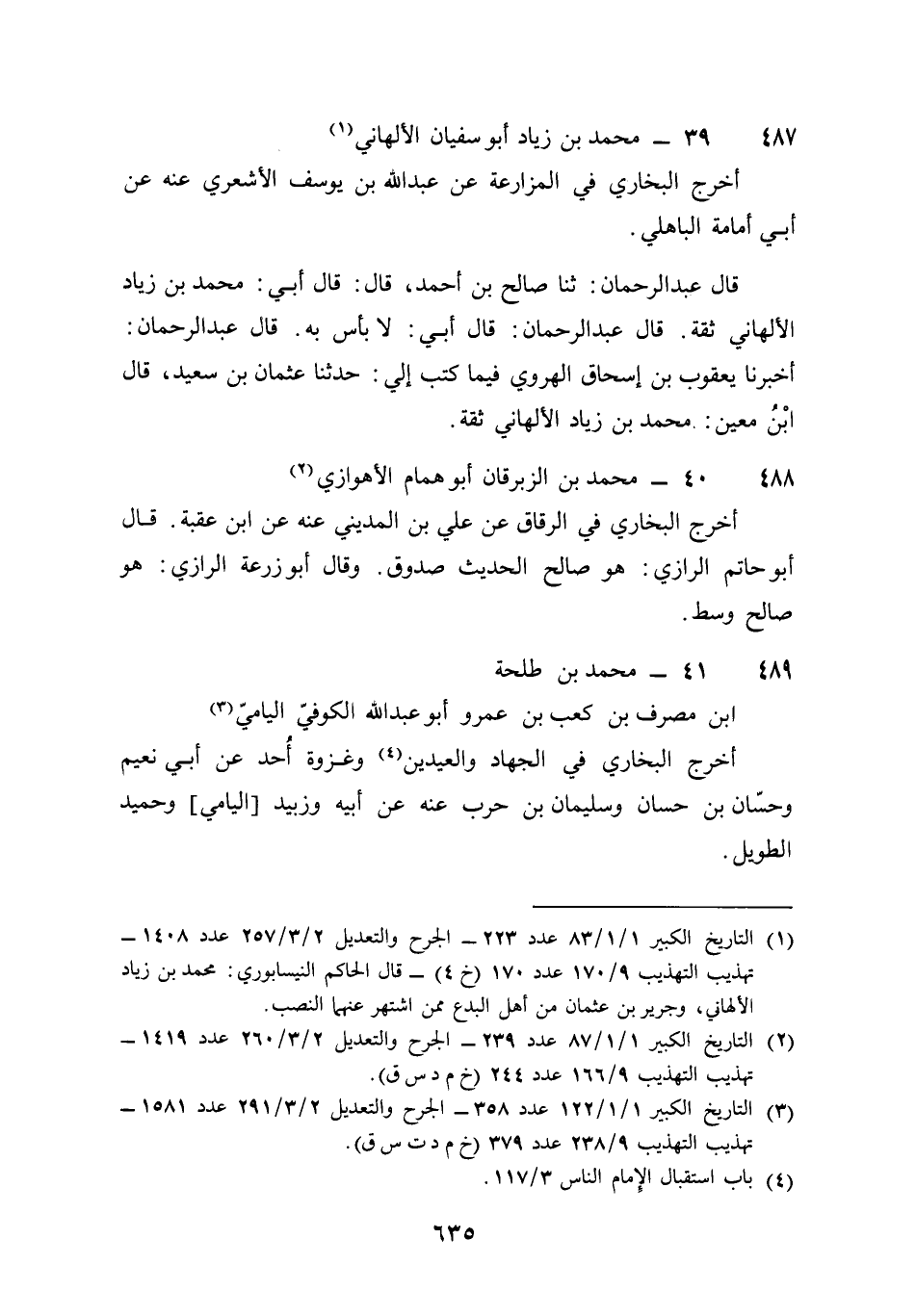 487 - مُحَمَّد بن زِيَاد أَبُو سُفْيَان الْأَلْهَانِي أخرج البُخَارِيّ فِي الْمُزَارعَة عَن عبد الله بن يُوسُف الْأَشْعَرِيّ عَنهُ عَن أبي أُمَامَة الْبَاهِلِيّ قَالَ عبد الرَّحْمَن ثَنَا صَالح بن أَحْمد قَالَ قَالَ أبي مُحَمَّد بن زِيَاد الْأَلْهَانِي ثِقَة قَالَ عبد الرَّحْمَن قَالَ أبي لَا بَأْس بِهِ قَالَ عبد الرَّحْمَن أخبرنَا يَعْقُوب بن إِسْحَاق الْهَرَوِيّ فِيمَا كتب إِلَيّ حَدثنَا عُثْمَان بن سعيد قَالَ بن معِين مُحَمَّد بن زِيَاد الْأَلْهَانِي ثِقَة