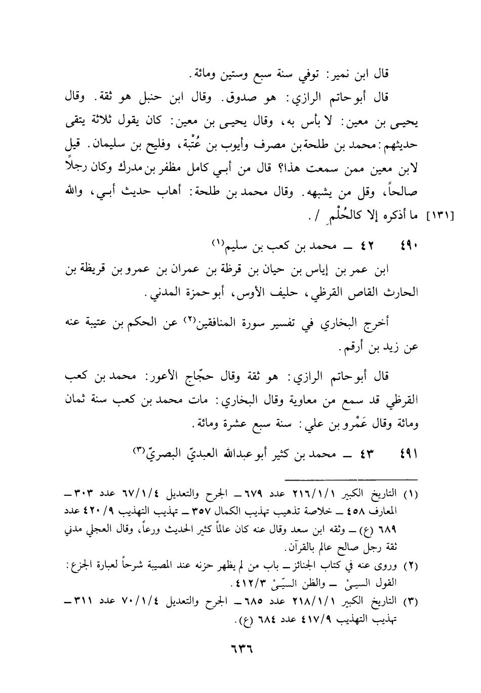490 - مُحَمَّد بن كَعْب بن سليم بن عمر بن إِيَاس بن حَيَّان بن قرظة بن عمرَان بن عَمْرو بن قُرَيْظَة بن الْحَارِث الْقَاص الْقرظِيّ حَلِيف الْأَوْس أَبُو حَمْزَة الْمدنِي أخرج البُخَارِيّ فِي تَفْسِير سُورَة الْمُنَافِقين عَن الحكم بن عتيبة عَنهُ عَن زيد بن أَرقم قَالَ أَبُو حَاتِم الرَّازِيّ هُوَ ثِقَة وَقَالَ حجاج الْأَعْوَر مُحَمَّد بن كَعْب الْقرظِيّ قد سمع من مُعَاوِيَة وَقَالَ البُخَارِيّ مَاتَ مُحَمَّد بن كَعْب سنة ثَمَان وَمِائَة وَقَالَ عَمْرو بن عَليّ سنة سبع عشرَة وَمِائَة