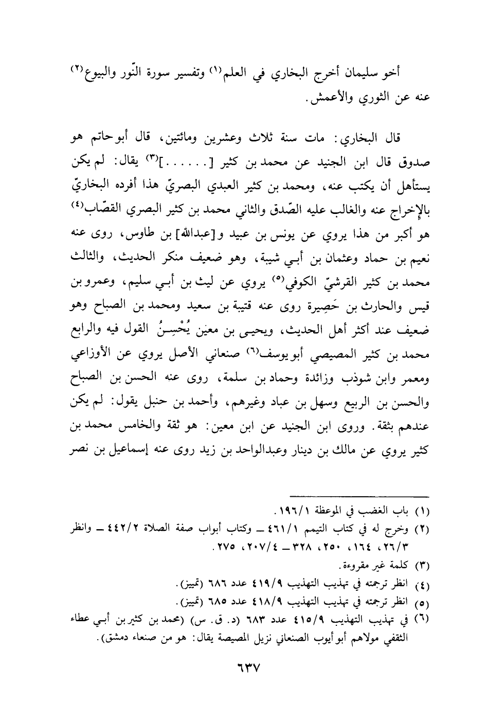 أَخُو سُلَيْمَان أخرج البُخَارِيّ فِي الْعلم وَتَفْسِير سُورَة النُّور والبيوع عَنهُ عَن الثَّوْريّ وَالْأَعْمَش قَالَ البُخَارِيّ مَاتَ سنة ثَلَاث وَعشْرين وَمِائَتَيْنِ قَالَ أَبُو حَاتِم هُوَ صَدُوق قَالَ بن الْجُنَيْد عَن مُحَمَّد بن كثير يُقَال لم يكن يستأهل أَن يكْتب عَنهُ وَمُحَمّد بن كثير الْعَبْدي الْبَصْرِيّ هَذَا أفرده البُخَارِيّ بِالْإِخْرَاجِ عَنهُ وَالْغَالِب عَلَيْهِ الصدْق وَالثَّانِي مُحَمَّد بن كثير الْبَصْرِيّ القصاب هُوَ أكبر من هَذَا يروي عَن يُونُس بن عبيد وَعبد الله بن طَاوس روى عَنهُ نعيم بن حَمَّاد وَعُثْمَان بن أبي شيبَة وَهُوَ ضَعِيف مُنكر الحَدِيث وَالثَّالِث مُحَمَّد بن كثير الْقرشِي الْكُوفِي يروي عَن لَيْث بن أبي سليم وَعَمْرو بن قيس والْحَارث بن حصيرة روى عَنهُ قُتَيْبَة بن سعيد وَمُحَمّد بن الصَّباح وَهُوَ ضَعِيف عِنْد أَكثر أهل الحَدِيث وَيحيى بن معِين يحسن القَوْل فِيهِ وَالرَّابِع مُحَمَّد بن كثير المصِّيصِي أَبُو يُوسُف صنعاني الأَصْل يروي عَن الْأَوْزَاعِيّ وَمعمر وَابْن شَوْذَب وزائدة وَحَمَّاد بن سَلمَة روى عَنهُ الْحسن بن الصَّباح وَالْحسن بن الرّبيع وَسَهل بن عباد وَغَيرهم وَأحمد بن حَنْبَل يَقُول لم يكن عِنْدهم بِثِقَة وروى بن الْجُنَيْد عَن بن معِين هُوَ ثِقَة وَالْخَامِس مُحَمَّد بن كثير يروي عَن مَالك بن دِينَار وَعبد الْوَاحِد بن زيد روى عَنهُ إِسْمَاعِيل بن نصر وَهُوَ مَجْهُول وَالسَّادِس مُحَمَّد بن كثير بن مَرْوَان يروي عَن عبد الرَّحْمَن بن أبي الزِّنَاد روى عَنهُ عَليّ بن الْحُسَيْن بن الْجُنَيْد وَقَالَ مُنكر الحَدِيث