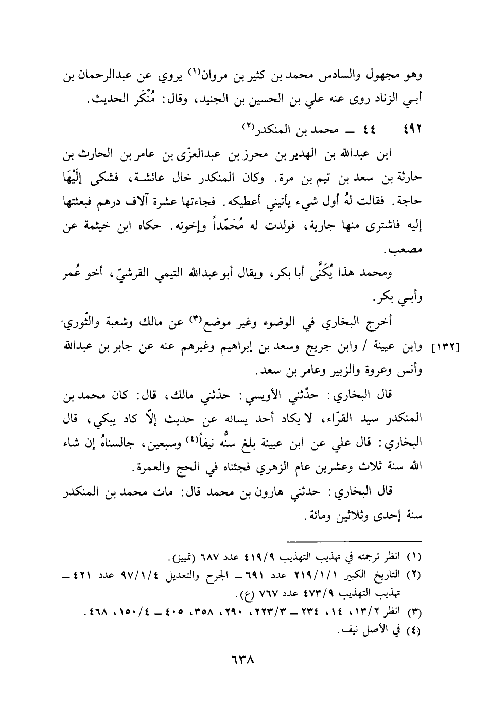 492 - مُحَمَّد بن الْمُنْكَدر بن عبد الله بن الهدير بن مُحرز بن عبد الْعُزَّى بن عَامر بن الْحَارِث بن حَارِثَة بن سعد بن تيم بن مرّة وَكَانَ الْمُنْكَدر خَال عَائِشَة فَشكى إِلَيْهَا حَاجَة فَقَالَت لَهُ أول شَيْء يأتيني أعطيكه فجاءتها عشرَة آلَاف دِرْهَم فبعثتها إِلَيْهِ فَاشْترى مِنْهَا جَارِيَة فَولدت لَهُ مُحَمَّدًا وَإِخْوَته حَكَاهُ بن خَيْثَمَة عَن مُصعب وَمُحَمّد هَذَا يكنى أَبَا بكر وَيُقَال أَبُو عبد الله التَّيْمِيّ الْقرشِي أَخُو عمر وَأبي بكر أخرج البُخَارِيّ فِي الْوضُوء وَغير مَوضِع عَن مَالك وَشعْبَة وَالثَّوْري وَابْن عُيَيْنَة وَابْن جريج وَسعد بن إِبْرَاهِيم وَغَيرهم عَنهُ عَن جَابر بن عبد الله وَأنس وَعُرْوَة وَالزُّبَيْر وعامر بن سعد قَالَ البُخَارِيّ حَدثنِي الأويسي حَدثنِي مَالك قَالَ كَانَ مُحَمَّد بن الْمُنْكَدر سيد الْقُرَّاء لَا يكَاد أحد يسْأَله عَن حَدِيث إِلَّا كَاد يبكي قَالَ البُخَارِيّ قَالَ عَليّ عَن بن عُيَيْنَة بلغ سنه نيفا وَسبعين جالسناه إِن شَاءَ الله سنة ثَلَاث وَعشْرين عَام الزُّهْرِيّ فجئناه فِي الْحَج وَالْعمْرَة قَالَ البُخَارِيّ حَدثنِي هَارُون بن مُحَمَّد قَالَ مَاتَ مُحَمَّد بن الْمُنْكَدر سنة إِحْدَى وَثَلَاثِينَ وَمِائَة قَالَ أَبُو حَاتِم الرَّازِيّ هُوَ ثِقَة
