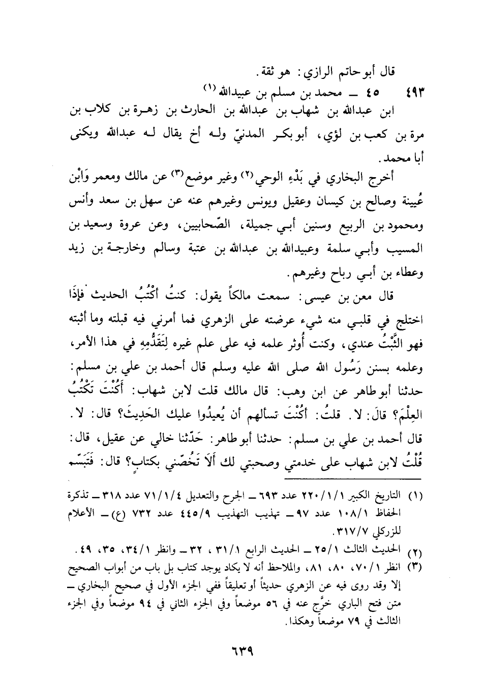 493 - مُحَمَّد بن مُسلم بن عبيد الله بن عبد الله بن شهَاب بن عبد الله بن الْحَارِث بن زهرَة بن كلاب بن مرّة بن كَعْب بن لؤَي أَبُو بكر الْمدنِي وَله أَخ يُقَال لَهُ عبد الله ويكنى أَبَا مُحَمَّد أخرج البُخَارِيّ فِي بَدْء الْوَحْي وَغير مَوضِع عَن مَالك وَمعمر وَابْن عُيَيْنَة وَصَالح بن كيسَان وَعقيل وَيُونُس وَغَيرهم عَنهُ عَن سهل بن سعد وَأنس ومحمود بن الرّبيع وسنين أبي جميلَة الصحابيين وَعَن عُرْوَة وَسَعِيد بن الْمسيب وَأبي سَلمَة وَعبيد الله بن عبد الله بن عتبَة وَسَالم وخارجة بن زيد وَعَطَاء بن أبي رَبَاح وَغَيرهم قَالَ معن بن عِيسَى سَمِعت مَالِكًا يَقُول كنت أكتب الحَدِيث فَإِذا اختلج فِي قلبِي مِنْهُ شَيْء عرضته على الزُّهْرِيّ فَمَا أَمرنِي فِيهِ قبلته وَمَا أثْبته فَهُوَ الثبت عِنْدِي وَكنت أوثر علمه فِيهِ على علم غَيره لتقدمه فِي هَذَا الْأَمر وَعلمه بسنن رَسُول الله صلى الله عَلَيْهِ وَسلم قَالَ أَحْمد بن عَليّ بن مُسلم حَدثنَا أَبُو طَاهِر عَن بن وهب قَالَ مَالك قلت لِابْنِ شهَاب أَكنت تكْتب الْعلم قَالَ لَا قلت أَكنت تَسْأَلهُمْ أَن يُعِيدُوا عَلَيْك الحَدِيث قَالَ لَا قَالَ أَحْمد بن عَليّ بن مُسلم حَدثنَا أَبُو طَاهِر حَدثنَا خَالِي عَن عقيل قَالَ قلت لِابْنِ شهَاب على خدمتي وصحبتي لَك أَلا تخصني بِكِتَاب قَالَ فَتَبَسَّمَ وَقَالَ انْظُر فِي الْحَرج فَنَظَرت فَإِذا فِيهِ أَنْسَاب فَقَالَ مَا عِنْدِي كتاب غَيره قَالَ أَحْمد بن عَليّ بن مُسلم حَدثنَا مُحَمَّد بن رَافع قَالَ سَمِعت عبد الرَّزَّاق يَقُول قلت لمعمر هَل سمع الزُّهْرِيّ من بن عمر شَيْئا قَالَ نعم حديثين وَلم أسأله عَنْهُمَا قَالَ أَبُو بكر بن أبي خَيْثَمَة وَحدثنَا أَحْمد بن حَنْبَل حَدثنَا عبد الرَّحْمَن بن مهْدي عَن وهب قَالَ سَمِعت أَيُّوب يَقُول مَا رَأَيْت أعلم من الزُّهْرِيّ فَقَالَ لَهُ صَخْر بن جوَيْرِية وَلَا الْحسن قَالَ مَا رَأَيْت أعلم من الزُّهْرِيّ قَالَ أَبُو بكر وَحدثنَا أَبُو مُسلم عبد الرَّحْمَن بن يُونُس قَالَ قَالَ قَالَ سُفْيَان كَانُوا يَقُولُونَ مَا بَقِي من النَّاس أحد أعلم بِالسنةِ مِنْهُ قيل لِسُفْيَان الزُّهْرِيّ قَالَ نعم قَالَ أَبُو بكر حَدثنَا مُوسَى بن إِسْمَاعِيل قَالَ شهِدت وهيبا ومبشر بن مكسر وَبشر بن الْمفضل فِي آخَرين ذكرُوا الزُّهْرِيّ فَقَالُوا بِمن تقيسونه فَلم يَجدوا أحدا يقيسونه بِهِ إِلَّا الشّعبِيّ قَالَ أَبُو بكر حَدثنَا أَحْمد بن حَنْبَل ثَنَا عبد الرَّزَّاق ثَنَا معمر قَالَ قيل لِلزهْرِيِّ زَعَمُوا أَنَّك لَا تحدث عَن الموَالِي فَقَالَ إِنِّي لأحدث عَنْهُم وَلَكِن إِذا وجدت بن الْمُهَاجِرين وَالْأَنْصَار أتكىء عَلَيْهِم فَمَا أصنع بغيرهم ثَنَا أَبُو بكر ثَنَا الزبير أخبرنَا مُحَمَّد بن الْحسن عَن مَالك قَالَ أول من كَون الْعلم بن شهَاب قَالَ أَبُو بكر بن أبي خَيْثَمَة قَالَ الزبير بن بكار توفّي بن شهَاب لَيْلَة الثُّلَاثَاء لتسْع عشرَة لَيْلَة خلت من شهر رَمَضَان وَهُوَ بن اثْنَتَيْنِ وَتِسْعين سنة قَالَ البُخَارِيّ ثَنَا عَليّ ثَنَا سُفْيَان قَالَ مَاتَ الزُّهْرِيّ سنة أَربع وَعشْرين وَمِائَة