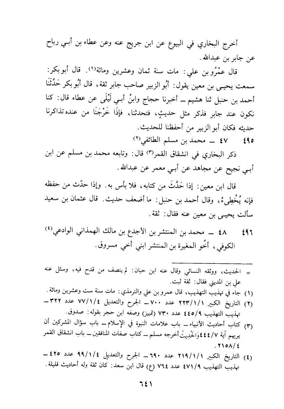 495 - مُحَمَّد بن مُسلم الطَّائِفِي ذكر البُخَارِيّ فِي انْشِقَاق الْقَمَر قَالَ وَتَابعه مُحَمَّد بن مُسلم عَن بن أبي نجيح عَن مُجَاهِد عَن أبي معمر عَن عبد الله قَالَ بن معِين إِذا حدث من كِتَابه فَلَا بَأْس بِهِ وَإِذا حدث من حفظه فَإِنَّهُ يخطىء وَقَالَ أَحْمد بن حَنْبَل مَا أَضْعَف حَدِيث قَالَ عُثْمَان بن سعيد سَأَلت يحيى بن معِين عَنهُ فَقَالَ ثِقَة