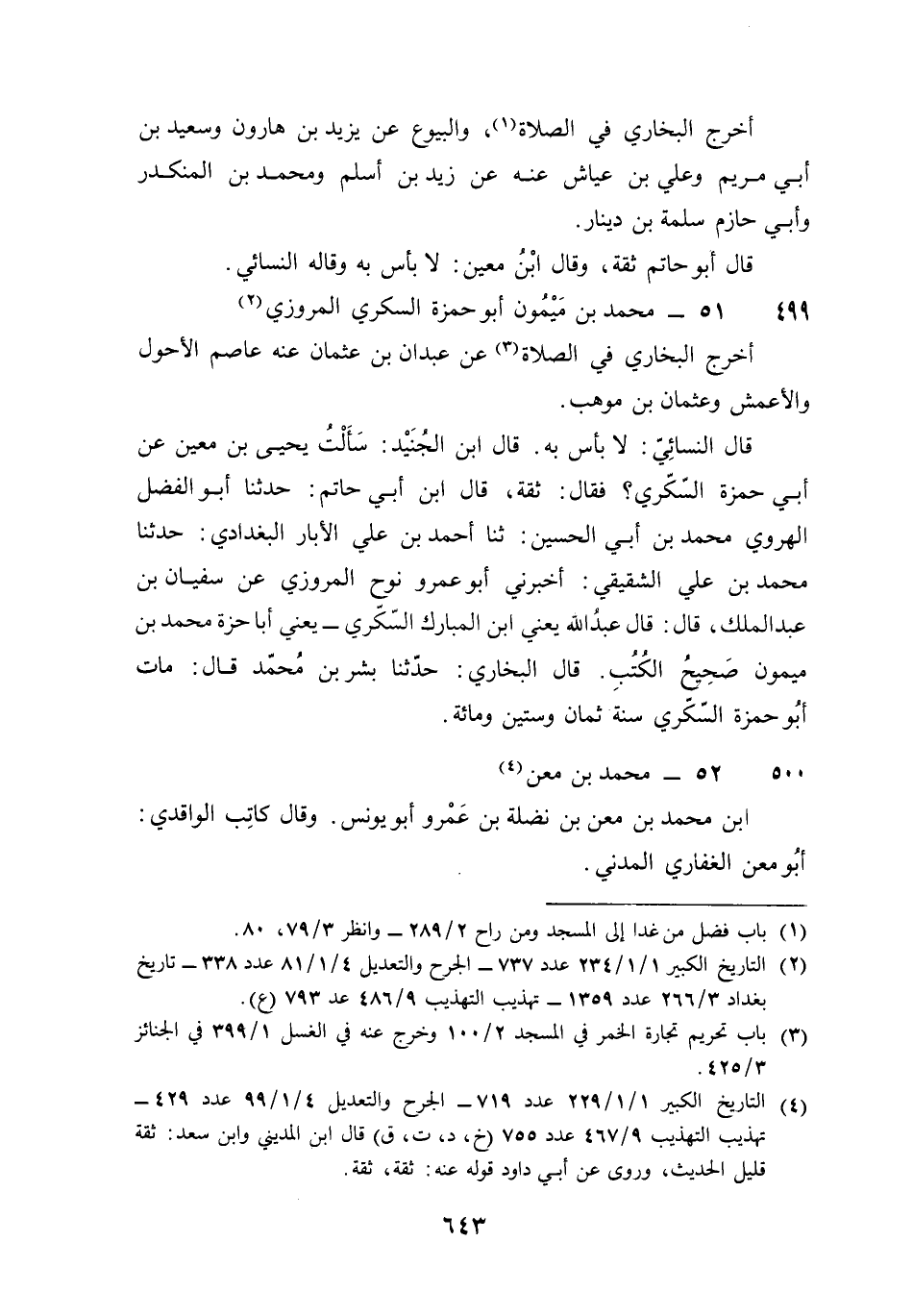 499 - مُحَمَّد بن مَيْمُون أَبُو حَمْزَة السكرِي الْمروزِي أخرج البُخَارِيّ فِي الصَّلَاة عَن عَبْدَانِ بن عُثْمَان عَنهُ عَاصِم الْأَحول وَالْأَعْمَش وَعُثْمَان بن موهب قَالَ النَّسَائِيّ لَا بَأْس بِهِ قَالَ بن الْجُنَيْد سَأَلت يحيى بن معِين عَن أبي حَمْزَة السكرِي فَقَالَ ثِقَة قَالَ بن أبي حَاتِم حَدثنَا أَبُو الْفضل الْهَرَوِيّ مُحَمَّد بن أبي الْحُسَيْن ثَنَا أَحْمد بن عَليّ الْأَبَّار الْبَغْدَادِيّ حَدثنَا مُحَمَّد بن عَليّ الشقيقي أَخْبرنِي أَبُو عَمْرو نوح الْمروزِي عَن سُفْيَان بن عبد الْملك قَالَ قَالَ عبد الله يَعْنِي بن الْمُبَارك السكرِي يَعْنِي أَبَا حَمْزَة مُحَمَّد بن مَيْمُون صَحِيح الْكتب قَالَ البُخَارِيّ حَدثنَا بشر بن مُحَمَّد قَالَ مَاتَ أَبُو حَمْزَة السكرِي سنة ثَمَان وَسِتِّينَ وَمِائَة