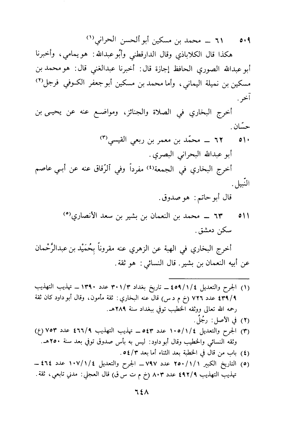 509 - مُحَمَّد بن مِسْكين أَبُو الْحسن الْحَرَّانِي هَكَذَا قَالَ الكلاباذي وَقَالَ الدَّارَقُطْنِيّ وَأَبُو عبد الله هُوَ يمامي وَأخْبرنَا أَبُو عبد الله الصُّورِي الْحَافِظ إجَازَة قَالَ أخبرنَا عبد الْغَنِيّ قَالَ هُوَ مُحَمَّد بن مِسْكين بن نميلَة الْيَمَانِيّ وَأما مُحَمَّد بن مِسْكين أَبُو جَعْفَر الْكُوفِي فَرجل آخر أخرج البُخَارِيّ فِي الصَّلَاة والجنائز ومواضع عَنهُ عَن يحيى بن حسان