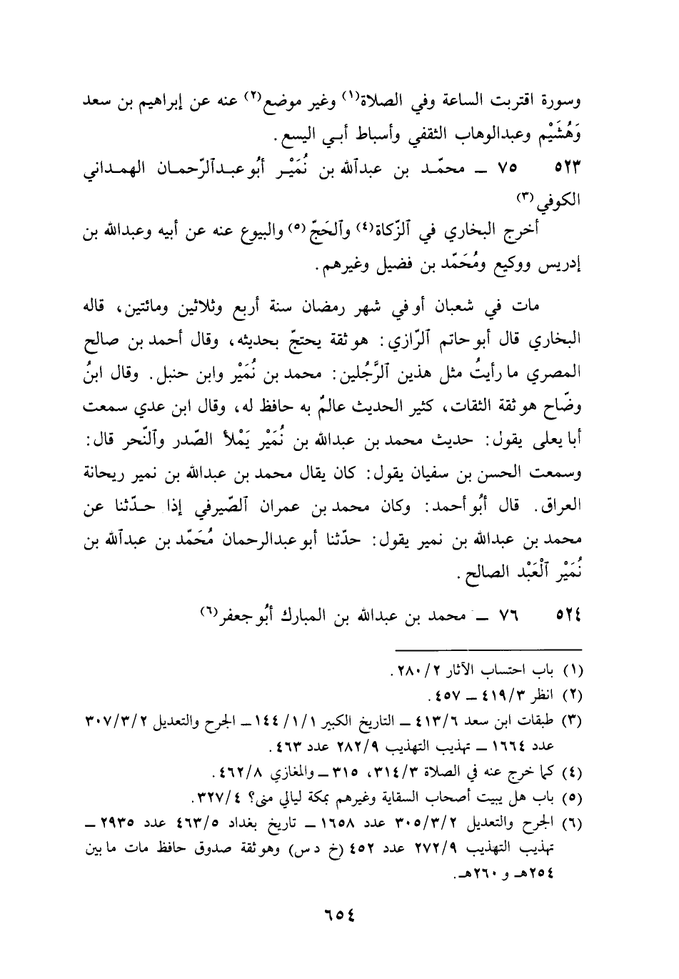 523 - مُحَمَّد بن عبد الله بن نمير أَبُو عبد الرَّحْمَن الْهَمدَانِي الْكُوفِي أخرج البُخَارِيّ فِي الزَّكَاة وَالْحج والبيوع عَنهُ عَن أَبِيه وَعبد الله بن إِدْرِيس ووكيع وَمُحَمّد بن فُضَيْل وَغَيرهم مَاتَ فِي شعْبَان أَو فِي شهر رَمَضَان سنة أَربع وَثَلَاثِينَ وَمِائَتَيْنِ قَالَه البُخَارِيّ قَالَ أَبُو حَاتِم الرَّازِيّ هُوَ ثِقَة يحْتَج بحَديثه وَقَالَ أَحْمد بن صَالح الْمصْرِيّ مَا رَأَيْت مثل هذَيْن الرجلَيْن مُحَمَّد بن نمير وَابْن حَنْبَل وَقَالَ بن وضاح هُوَ ثِقَة الثِّقَات كثير الحَدِيث عَالم بِهِ حَافظ لَهُ وَقَالَ بن عدي سَمِعت أَبَا يعلى يَقُول حَدِيث مُحَمَّد بن عبد الله بن نمير يمْلَأ الصَّدْر والنحر قَالَ وَسمعت الْحسن بن سُفْيَان يَقُول كَانَ يُقَال مُحَمَّد بن عبد الله بن نمير رَيْحَانَة الْعرَاق قَالَ أَبُو أَحْمد وَكَانَ مُحَمَّد بن عمرَان الصَّيْرَفِي إِذا حَدثنَا عَن مُحَمَّد بن عبد الله بن نمير يَقُول حَدثنَا أَبُو عبد الرَّحْمَن مُحَمَّد بن عبد الله بن نمير العَبْد الصَّالح