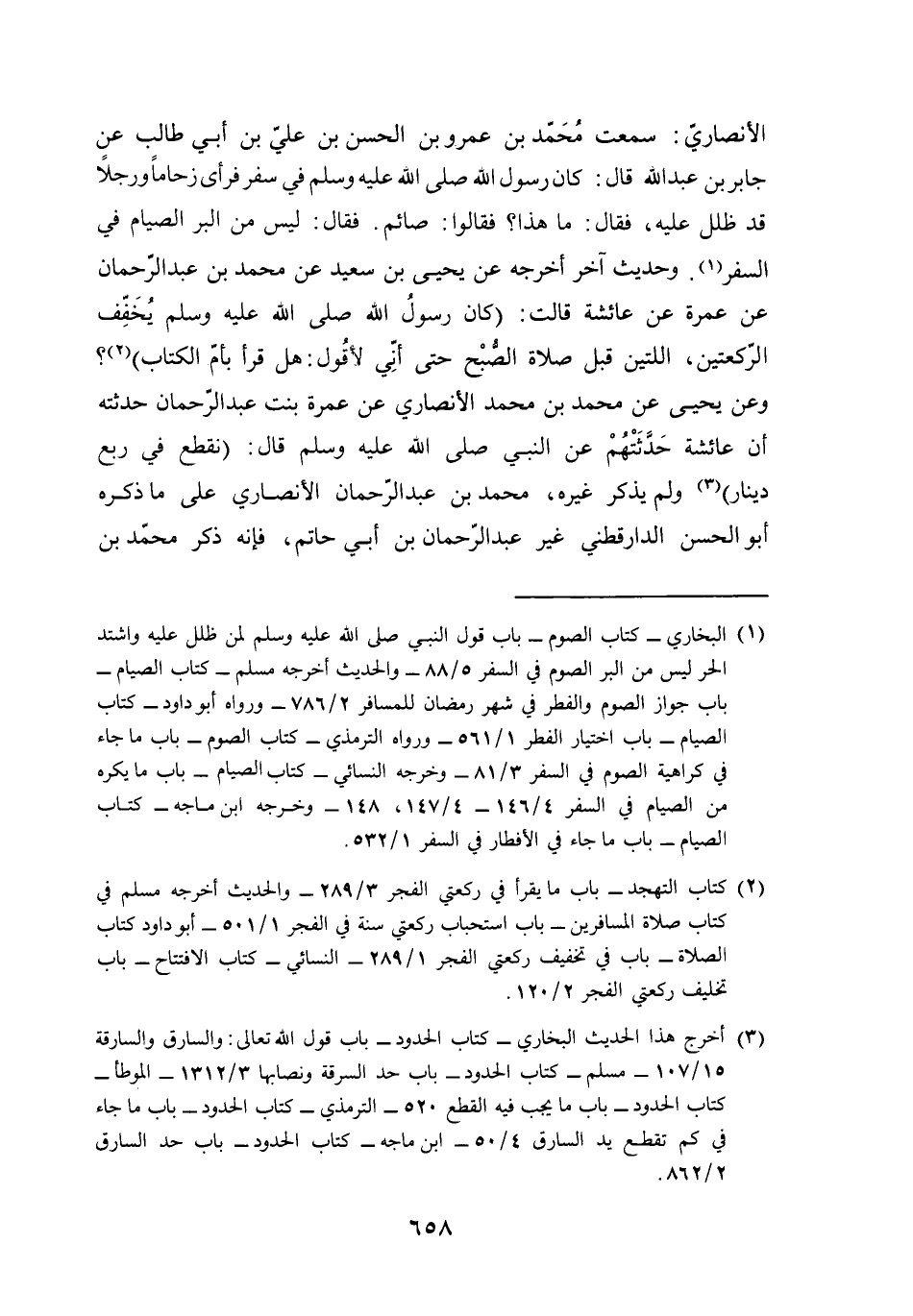 الْأنْصَارِيّ سَمِعت مُحَمَّد بن عَمْرو بن الْحسن بن عَليّ بن أبي طَالب عَن جَابر بن عبد الله قَالَ كَانَ رَسُول الله صلى الله عَلَيْهِ وَسلم فِي سفر فَرَأى زحاما ورجلا قد ظلل عَلَيْهِ فَقَالَ مَا هَذَا فَقَالُوا صَائِم فَقَالَ لَيْسَ من الْبر الصّيام فِي السّفر وَحَدِيث آخر أخرجه عَن يحيى بن سعيد عَن مُحَمَّد بن عبد الرَّحْمَن عَن عمْرَة عَن عَائِشَة قَالَت كَانَ رَسُول الله صلى الله عَلَيْهِ وَسلم يُخَفف الرَّكْعَتَيْنِ اللَّتَيْنِ قبل صَلَاة الصُّبْح حَتَّى أَنِّي لأقول هَل قَرَأَ بِأم الْكتاب وَعَن يحيى عَن مُحَمَّد بن مُحَمَّد الْأنْصَارِيّ عَن عمْرَة بنت عبد الرَّحْمَن حدثنه أَن عَائِشَة حدثتهم عَن النَّبِي صلى الله عَلَيْهِ وَسلم قَالَ نقطع فِي ربع دِينَار وَلم يذكر غَيره مُحَمَّد بن عبد الرَّحْمَن الْأنْصَارِيّ على مَا ذكره أَبُو الْحسن الدَّارَقُطْنِيّ غير عبد الرَّحْمَن بن أبي حَاتِم فَإِنَّهُ ذكر مُحَمَّد بن عبد الرَّحْمَن الْأنْصَارِيّ يروي عَن مُحَمَّد بن مَيْمُون وَسمعت أبي يَقُول هما مَجْهُولَانِ وَأخرج بن أبي خَيْثَمَة فِي تَارِيخه قَالَ سَمِعت مُصعب بن عبد الله يَقُول كَانَ مُحَمَّد بن عبد الرَّحْمَن بن مُحَمَّد بن عبد الرَّحْمَن بن أسعد بن زُرَارَة واليا لعمر بن عبد الْعَزِيز على الْيَمَامَة يرْوى عَنهُ الحَدِيث وَكَانَ رجلا صَالحا قدم عَلَيْهِ رَسُول عمر بِعَهْد فَلم يُعْطه شَيْئا فَغَضب فَقَالَ أتغضب عَليّ فِي عهد جئتني بِهِ فوَاللَّه لَو أتيتني بتمرتين لكانتا أحب إِلَيّ مِنْهُ وَكَانَ مَعَه خبيب بن عبد الرَّحْمَن بن خبيب فِي ولَايَته بِالْيَمَامَةِ