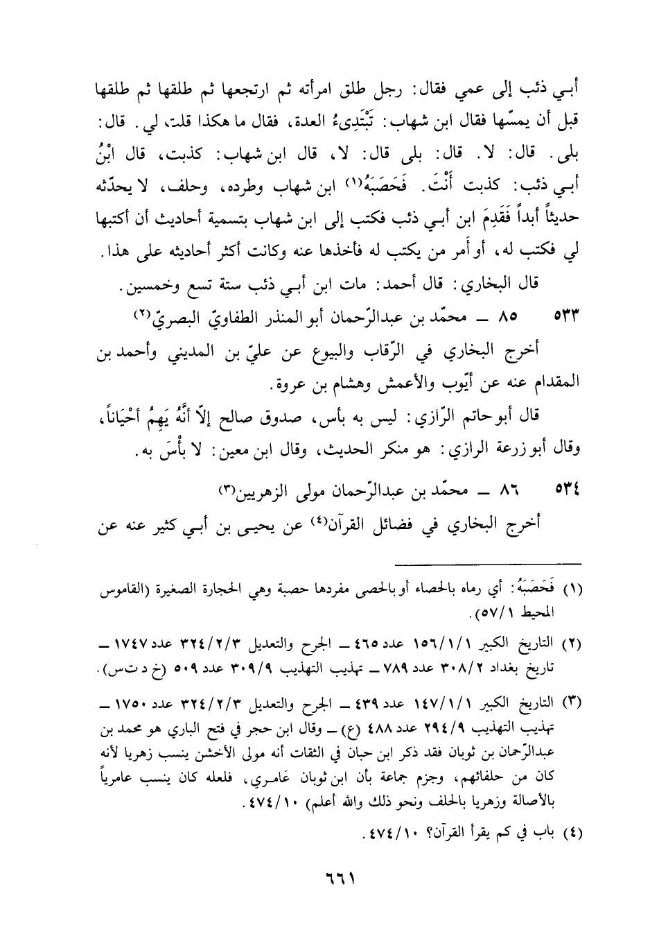 534 - مُحَمَّد بن عبد الرَّحْمَن مولى الزهريين أخرج البُخَارِيّ فِي فَضَائِل الْقُرْآن عَن يحيى بن أبي كثير عَنهُ عَن أبي سَلمَة بن عبد الرَّحْمَن قَالَ يحيى وأحسبني أَنا سَمِعت من أبي سَلمَة عَن عبد الله بن عَمْرو قَالَ رَسُول الله صلى الله عَلَيْهِ وَسلم اقْرَأ الْقُرْآن فِي شهر الحَدِيث