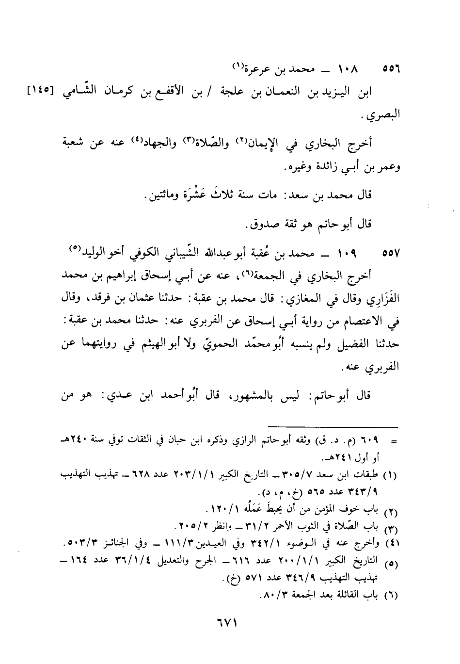 557 - مُحَمَّد بن عقبَة أَبُو عبد الله الشيبابي الْكُوفِي أَخُو الْوَلِيد أخرج البُخَارِيّ فِي الْجُمُعَة عَنهُ عَن أبي إِسْحَاق إِبْرَاهِيم بن مُحَمَّد الْفَزارِيّ وَقَالَ فِي الْمَغَازِي قَالَ مُحَمَّد بن عقبَة حَدثنَا عُثْمَان بن فرقد وَقَالَ فِي الِاعْتِصَام من رِوَايَة أبي إِسْحَاق عَن الْفربرِي عَنهُ حَدثنَا مُحَمَّد بن عقبَة حَدثنَا الفضيل وَلم ينْسبهُ أَبُو مُحَمَّد الْحَمَوِيّ وَلَا أَبُو الْهَيْثَم فِي روايتهما عَن الْفربرِي عَنهُ قَالَ أَبُو حَاتِم لَيْسَ بالمشهور قَالَ أَبُو أَحْمد بن عدي هُوَ من الثِّقَات قَالَ أَبُو الْحسن مُحَمَّد بن عقبَة الشَّيْبَانِيّ عَن أبي إِسْحَاق الْفَزارِيّ لم يزدْ على ذَلِك وَقَالَ أَبُو عبد الله بن البيع مُحَمَّد بن عقبَة الشَّيْبَانِيّ الْكُوفِي أَخُو الْوَلِيد بن عقبَة جد شَيخنَا أبي الْحسن بن عقبَة ذكر ذَلِك فِي من انْفَرد البُخَارِيّ بِهِ وَذكره بعده مُحَمَّد بن عقبَة بن مَيْمُون وَلَا أصل لَهُ فِي الْكتاب وَلَعَلَّه تصحف للناسخ من مُحَمَّد بن عبيد بن مَيْمُون وَذكر أَبُو عبد الله قبل ذكر هَذَا فِيمَن اتّفق عَلَيْهِ مُحَمَّد بن عقبَة أَخُو مُوسَى وَالصَّحِيح أَنه مِمَّن انْفَرد بِهِ مُسلم