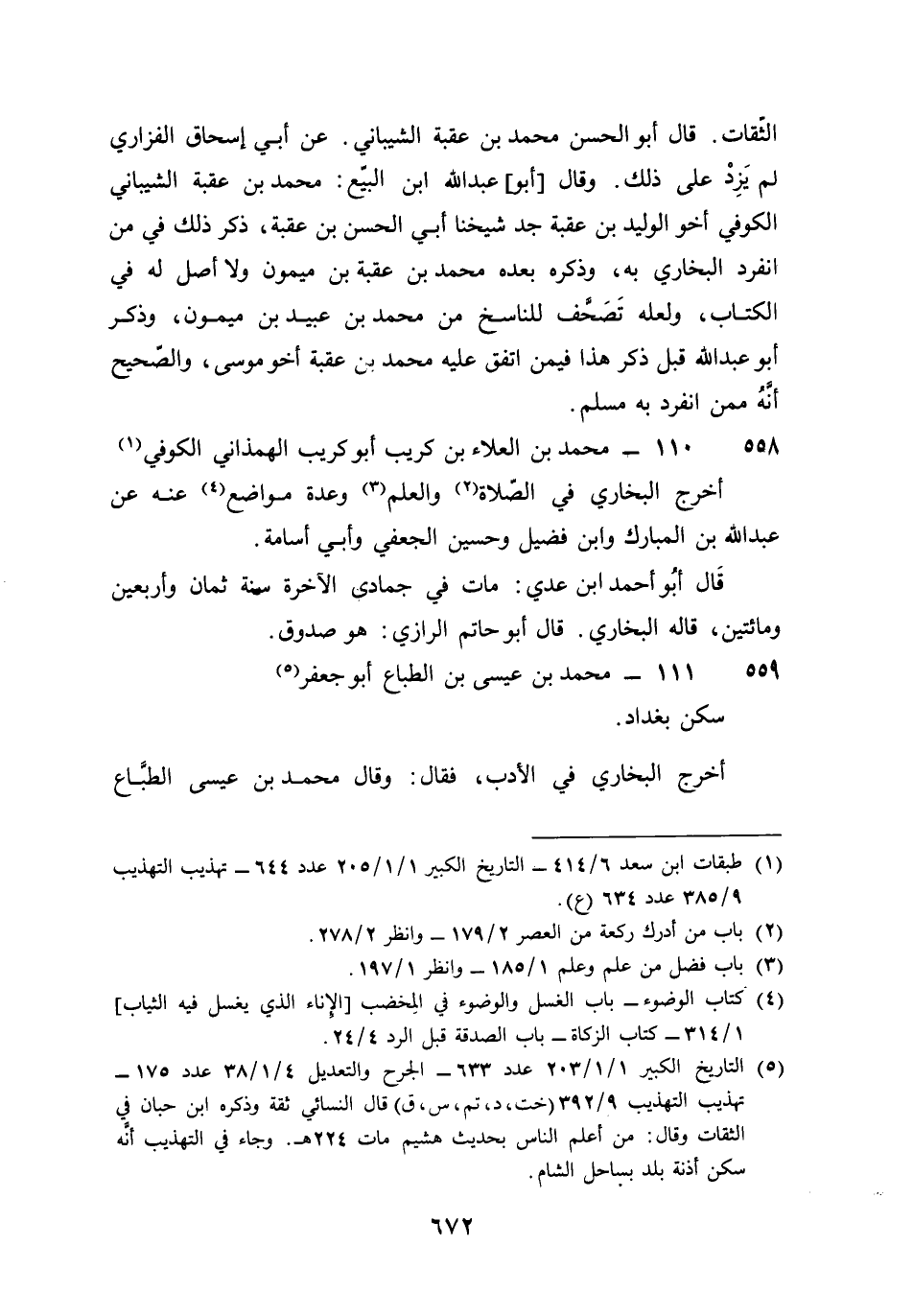 559 - مُحَمَّد بن عِيسَى بن الطباع أَبُو جَعْفَر سكن بَغْدَاد أخرج البُخَارِيّ فِي الْأَدَب فَقَالَ وَقَالَ مُحَمَّد بن عِيسَى الطباع أَبُو جَعْفَر سكن بَغْدَاد حَدثنَا هشيم ثَنَا حميد الطَّوِيل حَدثنَا أنس بن مَالك قَالَ كَانَت الْأمة من إِمَاء الْمَدِينَة لتأْخذ بيد رَسُول الله صلى الله عَلَيْهِ وَسلم فتنطلق بِهِ وَقَالَ فِي الْحَج وَقَالَ مُحَمَّد بن عِيسَى حَدثنَا حَمَّاد بن زيد قَالَ عبد الرَّحْمَن سَمِعت أبي يَقُول قلت لِأَحْمَد بن حَنْبَل عَمَّن ترى أَن أكتب المصنفات فَقَالَ عَن مُحَمَّد بن عِيسَى بن الطباع أَو أبي بكر بن أبي شيبَة وَإِبْرَاهِيم بن مُوسَى قَالَ وَسُئِلَ أبي عَن مُحَمَّد بن عِيسَى بن الطباع فَقَالَ ثِقَة مبرز وَقَالَ هُوَ الثِّقَة الْمَأْمُون مَا رَأَيْت من الْمُحدثين أحفظ للأبواب مِنْهُ