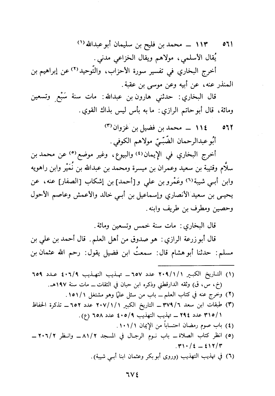 562 - مُحَمَّد بن فُضَيْل بن غَزوَان أَبُو عبد الرَّحْمَن الضَّبِّيّ مَوْلَاهُم الْكُوفِي أخرج البُخَارِيّ فِي الْإِيمَان والبيوع وَغير مَوضِع عَن مُحَمَّد بن سَلام وقتيبة بن سعيد وَعمْرَان بن ميسرَة وَمُحَمّد بن عبد الله بن نمير وَابْن رَاهَوَيْه وَابْن أبي شيبَة وَعَمْرو بن عَليّ وَأحمد بن إشكاب الصفار عَنهُ عَن يحيى بن سعيد الْأنْصَارِيّ وَإِسْمَاعِيل بن أبي خَالِد وَالْأَعْمَش وَعَاصِم الْأَحول وحصين ومطرف بن طريف وَابْنه قَالَ البُخَارِيّ مَاتَ سنة خمس وَتِسْعين وَمِائَة قَالَ أَبُو زرْعَة الرَّازِيّ هُوَ صَدُوق من أهل الْعلم قَالَ أَحْمد بن عَليّ بن مُسلم حَدثنَا أَبُو هِشَام قَالَ سَمِعت بن فُضَيْل يَقُول رحم الله عُثْمَان بن عَفَّان وَلَا رحم من لَا يترحم عَلَيْهِ قَالَ وسمعته يحلف بِاللَّه أَنه لصَاحب سنة وَجَمَاعَة قَالَ أَبُو هِشَام وَرَأَيْت على خفه أثر الْمسْح وَصليت خَلفه مَا لَا أحصي فَلم أسمعهُ يجْهر يَعْنِي بالبسمله