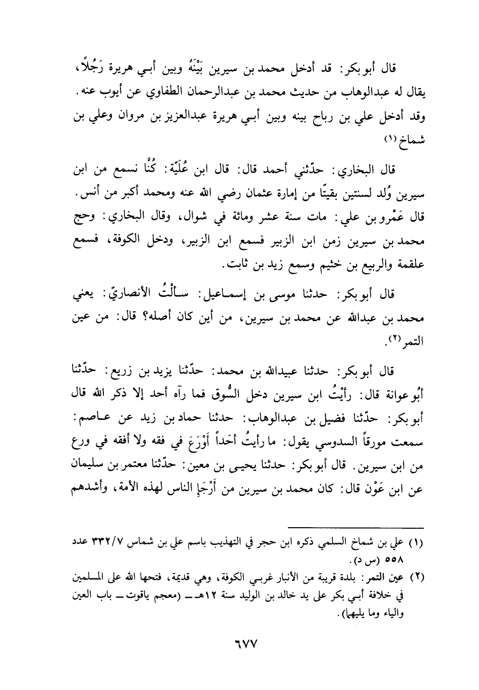 قَالَ أَبُو بكر قد أَدخل مُحَمَّد بن سِيرِين بَينه وَبَين أبي هُرَيْرَة رجلا يُقَال لَهُ عبد الْوَهَّاب من حَدِيث مُحَمَّد بن عبد الرَّحْمَن الطفَاوِي عَن أَيُّوب عَنهُ وَقد أَدخل عَليّ بن رَبَاح بَينه وَبَين أبي هُرَيْرَة عبد الْعَزِيز بن مَرْوَان وَعلي بن شماخ قَالَ البُخَارِيّ حَدثنِي أَحْمد قَالَ قَالَ بن علية كُنَّا نسْمع من بن سِيرِين ولد لِسنتَيْنِ بَقِيَتَا من إِمَارَة عُثْمَان رَضِي الله عَنهُ وَمُحَمّد أكبر من أنس قَالَ عَمْرو بن عَليّ مَاتَ سنة عشر وَمِائَة فِي شَوَّال وَقَالَ البُخَارِيّ وَحج مُحَمَّد بن سِيرِين زمن بن الزبير فَسمع بن الزبير وَدخل الْكُوفَة فَسمع عَلْقَمَة وَالربيع بن خثيم وَسمع زيد بن ثَابت قَالَ أَبُو بكر حَدثنَا مُوسَى بن إِسْمَاعِيل سَأَلت الْأنْصَارِيّ يَعْنِي مُحَمَّد بن عبد الله عَن مُحَمَّد بن سِيرِين من أَيْن كَانَ أَصله قَالَ من عين التَّمْر قَالَ أَبُو بكر حَدثنَا عبيد الله بن مُحَمَّد حَدثنَا يزِيد بن زُرَيْع حَدثنَا أَبُو عوَانَة قَالَ رَأَيْت بن سِيرِين دخل السُّوق فَمَا رَآهُ أحد إِلَّا ذكر الله قَالَ أَبُو بكر حَدثنَا فُضَيْل بن عبد الْوَهَّاب حَدثنَا حَمَّاد بن زيد عَن عَاصِم سَمِعت مورقا السدُوسِي يَقُول مَا رَأَيْت أحدا أورع فِي فقه وَلَا أفقه فِي ورع من بن سِيرِين قَالَ أَبُو بكر حَدثنَا يحيى بن معِين حَدثنَا مُعْتَمر بن سُلَيْمَان عَن بن عون قَالَ كَانَ مُحَمَّد بن سِيرِين من أرجإ النَّاس لهَذِهِ الْأمة وأشدهم إزراء على نَفسه قَالَ أَبُو بكر حَدثنَا إِبْرَاهِيم بن مُحَمَّد الشَّافِعِي حَدثنَا فُضَيْل بن عِيَاض عَن هِشَام عَن بن سِيرِين قَالَ إِن هَذَا الْعلم دين فانظروا عَمَّن تأخذونه قَالَ أَبُو بكر حَدثنَا عبيد الله بن عمر حَدثنَا حَمَّاد بن زيد عَن أَيُّوب وَهِشَام عَن مُحَمَّد بن سِيرِين قَالَ كَانُوا يَقُولُونَ إِن الْمُسلم الْمُسلم عِنْد الدِّرْهَم