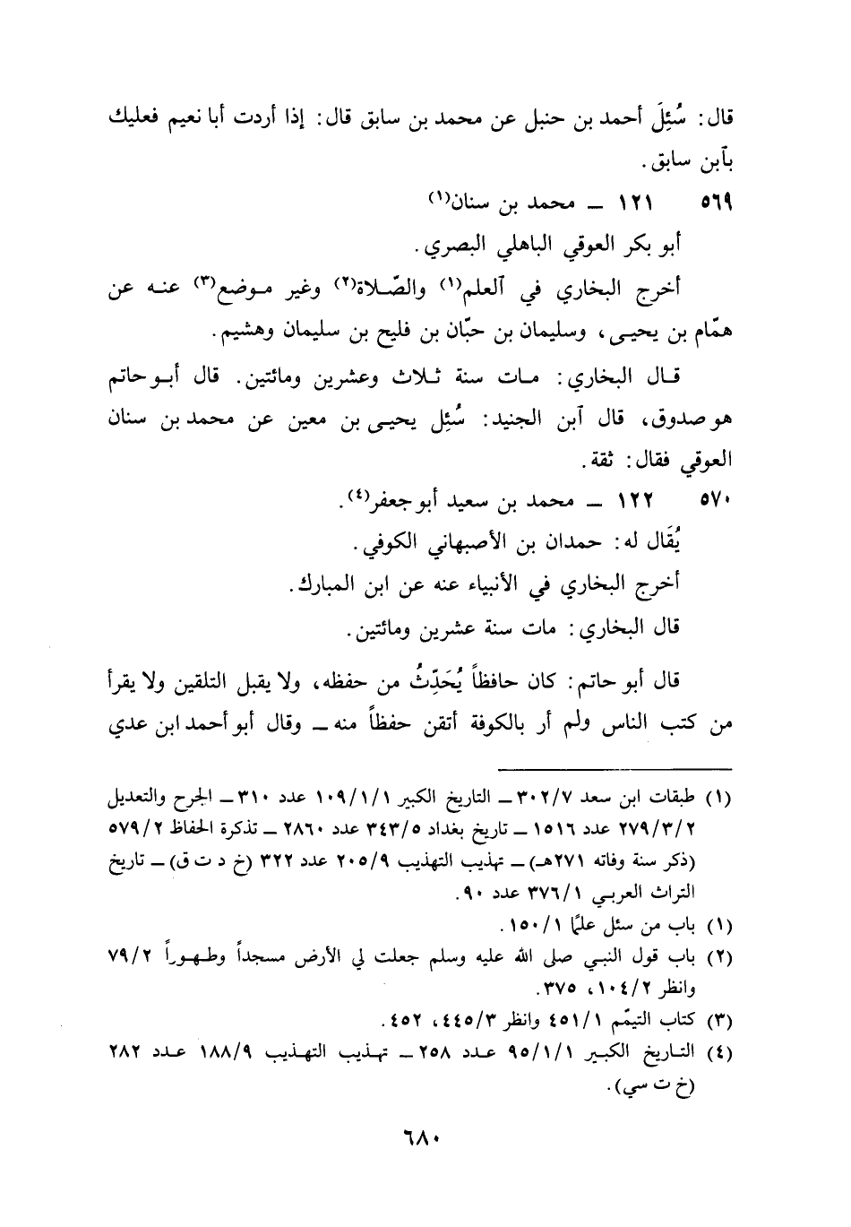 569 - مُحَمَّد بن سِنَان أَبُو بكر العوقي الْبَاهِلِيّ الْبَصْرِيّ أخرج البُخَارِيّ فِي الْعلم وَالصَّلَاة وَغير مَوضِع عَنهُ عَن همام بن يحيى وَسليمَان بن حبَان بن فليح بن سُلَيْمَان وهشيم قَالَ البُخَارِيّ مَاتَ سنة ثَلَاث وَعشْرين وَمِائَتَيْنِ قَالَ أَبُو حَاتِم هُوَ صَدُوق قَالَ آبن الْجُنَيْد سُئِلَ يحيى بن معِين عَن مُحَمَّد بن سِنَان العوقي فَقَالَ ثِقَة