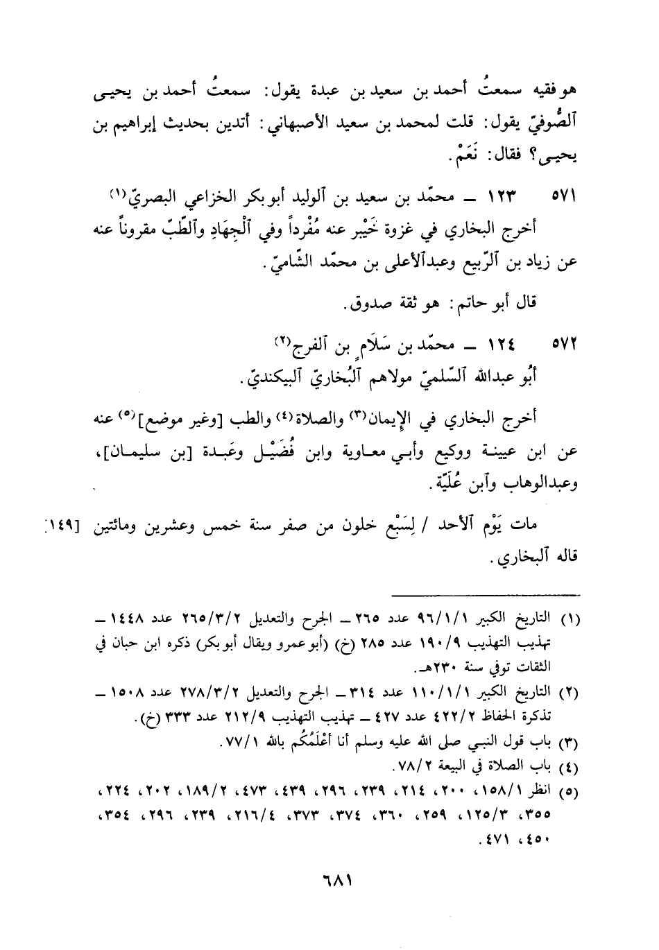 572 - مُحَمَّد بن سَلام بن الْفرج أَبُو عبد الله السّلمِيّ مَوْلَاهُم آلبخاري البيكندي أخرج البُخَارِيّ فِي الْإِيمَان وَالصَّلَاة والطب وَغير مَوضِع عَنهُ عَن بن عُيَيْنَة ووكيع وَأبي مُعَاوِيَة وَابْن فُضَيْل وَعَبدَة بن سُلَيْمَان وَعبد الْوَهَّاب وآبن علية مَاتَ يَوْم الْأَحَد لسبع خلون من صفر سنة خمس وَعشْرين وَمِائَتَيْنِ قَالَه آلبخاري قَالَ عبد الرَّحْمَن سَأَلت أبي عَنهُ فَقَالَ ثِقَة صَدُوق