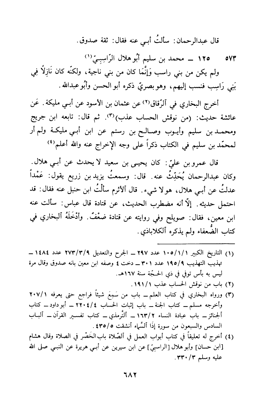 573 - مُحَمَّد بن سليم أَبُو هِلَال الرَّاسِبِي وَلم يكن من بني راسب وَإِنَّمَا كَانَ من بني نَاجِية وَلكنه كَانَ نازلا فِي بني راسب فنسب إِلَيْهِم وَهُوَ بَصرِي ذكره أَبُو الْحسن وَأَبُو عبد الله أخرج البُخَارِيّ فِي الرفاق عَن عُثْمَان بن الْأسود عَن أبي مليكَة عَن عَائِشَة حَدِيث من نُوقِشَ الْحساب عذب ثمَّ قَالَ تَابعه بن جريج وَمُحَمّد بن سليم وَأَيوب وَصَالح بن رستم عَن بن أبي مليكَة وَلم أر لمُحَمد بن سليم فِي الْكتاب ذكرا على وَجه الْإِخْرَاج عَنهُ وَالله أعلم قَالَ عَمْرو بن عَليّ كَانَ يحيى بن سعيد لَا يحدث عَن أبي هِلَال وَكَانَ عبد الرَّحْمَن يحدث عَنهُ قَالَ وَسمعت يزِيد بن زُرَيْع يَقُول عمدا عدلت عَن أبي هِلَال هُوَ لَا شَيْء قَالَ الْأَثْرَم سَأَلت بن حَنْبَل عَنهُ فَقَالَ قد احْتمل حَدِيثه إِلَّا أَنه مُضْطَرب الحَدِيث عَن قَتَادَة قَالَ عَبَّاس سَأَلت عَنهُ بن معِين فَقَالَ صُوَيْلِح وَفِي رِوَايَته عَن قَتَادَة ضعف وَأدْخلهُ البُخَارِيّ فِي كتاب الضُّعَفَاء وَلم يذكرهُ الكلاباذي