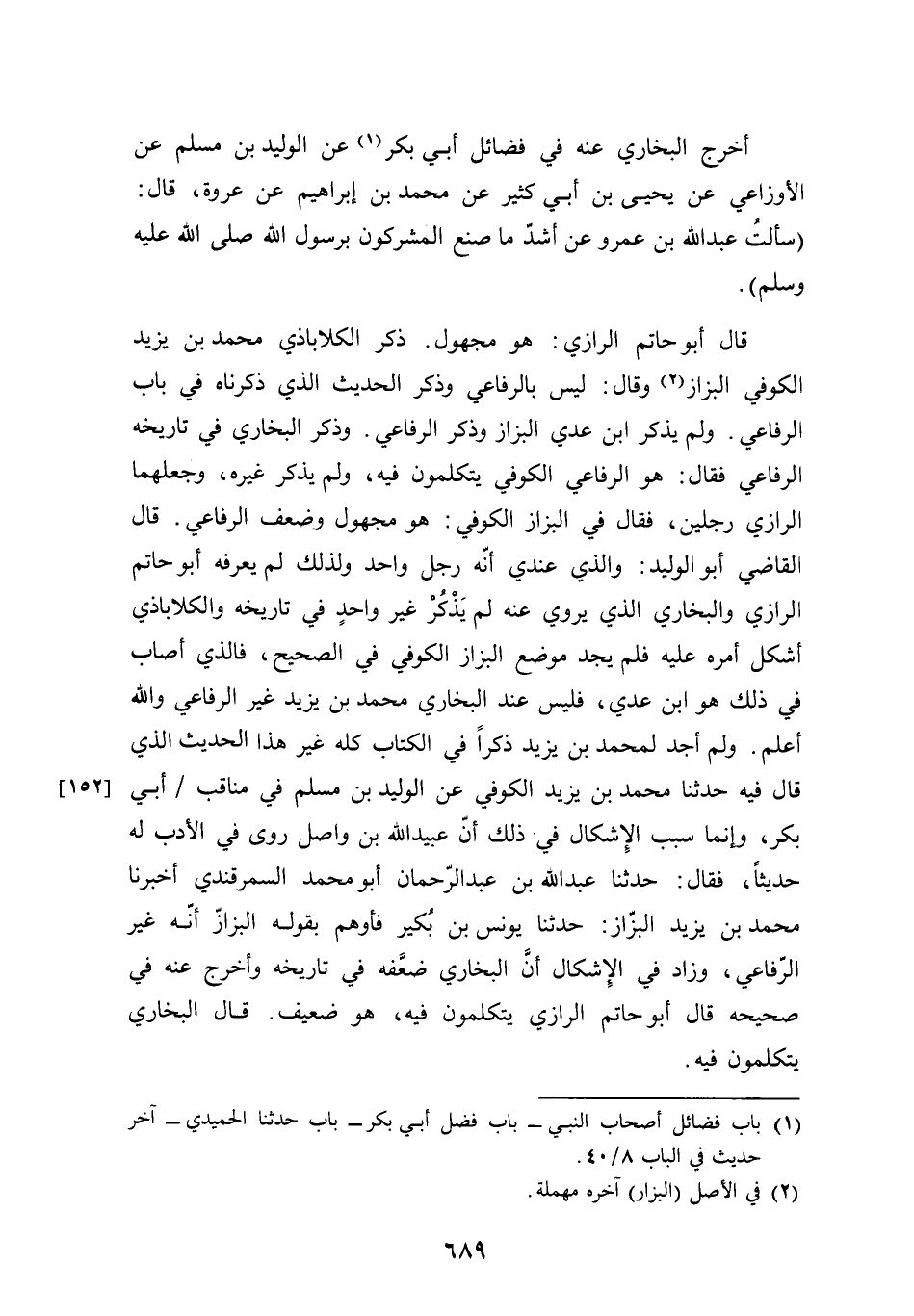أخرج البُخَارِيّ عَنهُ فِي فَضَائِل أبي بكر عَن الْوَلِيد بن مُسلم عَن الْأَوْزَاعِيّ عَن يحيى بن أبي كثير عَن مُحَمَّد بن إِبْرَاهِيم عَن عُرْوَة قَالَ سَأَلت عبد الله بن عَمْرو عَن أَشد مَا صنع الْمُشْركُونَ برَسُول الله صلى الله عَلَيْهِ وَسلم وَسلم قَالَ أَبُو حَاتِم الرَّازِيّ هُوَ مَجْهُول ذكر الكلاباذي مُحَمَّد بن يزِيد الْكُوفِي الْبَزَّاز وَقَالَ لَيْسَ بالرفاعي وَذكر الحَدِيث الَّذِي ذَكرْنَاهُ فِي بَاب الرِّفَاعِي وَلم يذكر بن عدي الْبَزَّاز وَذكر الرِّفَاعِي وَذكر البُخَارِيّ فِي تَارِيخه الرِّفَاعِي فَقَالَ هُوَ الرِّفَاعِي الْكُوفِي يَتَكَلَّمُونَ فِيهِ وَلم يذكر غَيره وجعلهما الرَّازِيّ رجلَيْنِ فَقَالَ فِي الْبَزَّاز الْكُوفِي هُوَ مَجْهُول وَضعف الرِّفَاعِي قَالَ القَاضِي أَبُو الْوَلِيد وَالَّذِي عِنْدِي أَنه رجل وَاحِد وَلذَلِك لم يعرفهُ أَبُو حَاتِم الرَّازِيّ وَالْبُخَارِيّ الَّذِي يروي عَنهُ لم يذكر غير وَاحِد فِي تَارِيخه والكلاباذي أشكل أمره عَلَيْهِ فَلم يجد مَوضِع الْبَزَّاز الْكُوفِي فِي الصَّحِيح فَالَّذِي أصَاب فِي ذَلِك هُوَ بن عدي فَلَيْسَ عِنْد البُخَارِيّ مُحَمَّد بن يزِيد غير الرِّفَاعِي وَالله أعلم وَلم أجد لمُحَمد بن يزِيد ذكرا فِي الْكتاب كُله غير هَذَا الحَدِيث الَّذِي قَالَ فِيهِ حَدثنَا مُحَمَّد بن يزِيد الْكُوفِي عَن الْوَلِيد بن مُسلم فِي مَنَاقِب أبي بكر وَإِنَّمَا سَبَب الْإِشْكَال فِي ذَلِك أَن عبيد الله بن وَاصل روى فِي الْأَدَب لَهُ حَدِيثا فَقَالَ حَدثنَا عبد الله بن عبد الرَّحْمَن أَبُو مُحَمَّد السَّمرقَنْدِي أخبرنَا مُحَمَّد بن يزِيد الْبَزَّاز حَدثنَا يُونُس بن بكير فأوهم بقوله الْبَزَّاز أَنه غير الرِّفَاعِي وَزَاد فِي الْإِشْكَال أَن البُخَارِيّ ضعفه فِي تَارِيخه وَأخرج عَنهُ فِي صَحِيحه قَالَ أَبُو حَاتِم الرَّازِيّ يَتَكَلَّمُونَ فِيهِ هُوَ ضَعِيف قَالَ البُخَارِيّ يَتَكَلَّمُونَ فِيهِ توفّي بِبَغْدَاد يَوْم الْأَرْبَعَاء منسلخ شعْبَان سنة ثَمَان وَأَرْبَعين وَمِائَتَيْنِ وَقد قَالَ أَبُو عبد الله فِيمَن أخرج عَنهُ البُخَارِيّ وَحده مُحَمَّد بن يزِيد بن جَارِيَة الْأنْصَارِيّ ثمَّ ذكر فِي آخر ذَلِك الْبَاب مُحَمَّد بن يزِيد الْكُوفِي عَن الْوَلِيد بن مُسلم وَلَيْسَ بِأبي هشيم فَعَاد الْأَمر كُله إِلَى أَن مُحَمَّد بن يزِيد الْكُوفِي إِنَّمَا يشيرون بِهِ إِلَى روى الَّذِي الحَدِيث الْمَذْكُور فَمرَّة يَقُولُونَ إِنَّه الرِّفَاعِي لِأَنَّهُ هُوَ الَّذِي روى الحَدِيث الْمَذْكُور عَن الْوَلِيد بن مُسلم وَمرَّة يَقُولُونَ هُوَ غَيره وَلم يذكر أَبُو الْحسن مُحَمَّد بن يزِيد فِيمَن أخرج عَنهُ البُخَارِيّ وَلَا مُسلم وَمُحَمّد بن يزِيد بن جَارِيَة الْأنْصَارِيّ غير مَعْرُوف وَالله أعلم وَقَالَ أَحْمد بن عدي سَمِعت عَبْدَانِ يَقُول كُنَّا عِنْد أبي بكر بن أبي شيبَة فِي جَنَازَة عبد الله بن براد الْأَشْعَرِيّ فَأقبل أَبُو هشيم رَاكِبًا دَابَّة قد خضب لحيته بِالْحِنَّاءِ فَقُلْنَا لأبي بكر مَا تَقول فِي أبي هشيم فَقَالَ مَا أحسن خضابه