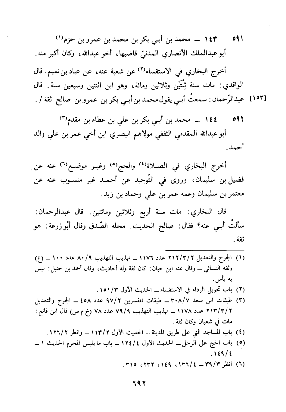 591 - مُحَمَّد بن أبي بكر بن مُحَمَّد بن عَمْرو بن حزم أَبُو عبد الْملك الْأنْصَارِيّ الْمدنِي قاضيها أَخُو عبد الله وَكَانَ أكبر مِنْهُ أخرج البُخَارِيّ فِي الاستقساء عَن شُعْبَة عَنهُ عَن عباد بن تَمِيم قَالَ الْوَاقِدِيّ مَاتَ سنة ثِنْتَيْنِ وَثَلَاثِينَ وَمِائَة وَهُوَ بن اثْنَتَيْنِ وَسبعين سنة قَالَ عبد الرَّحْمَن سَمِعت أبي يَقُول مُحَمَّد بن أبي بكر بن عَمْرو بن صَالح ثِقَة