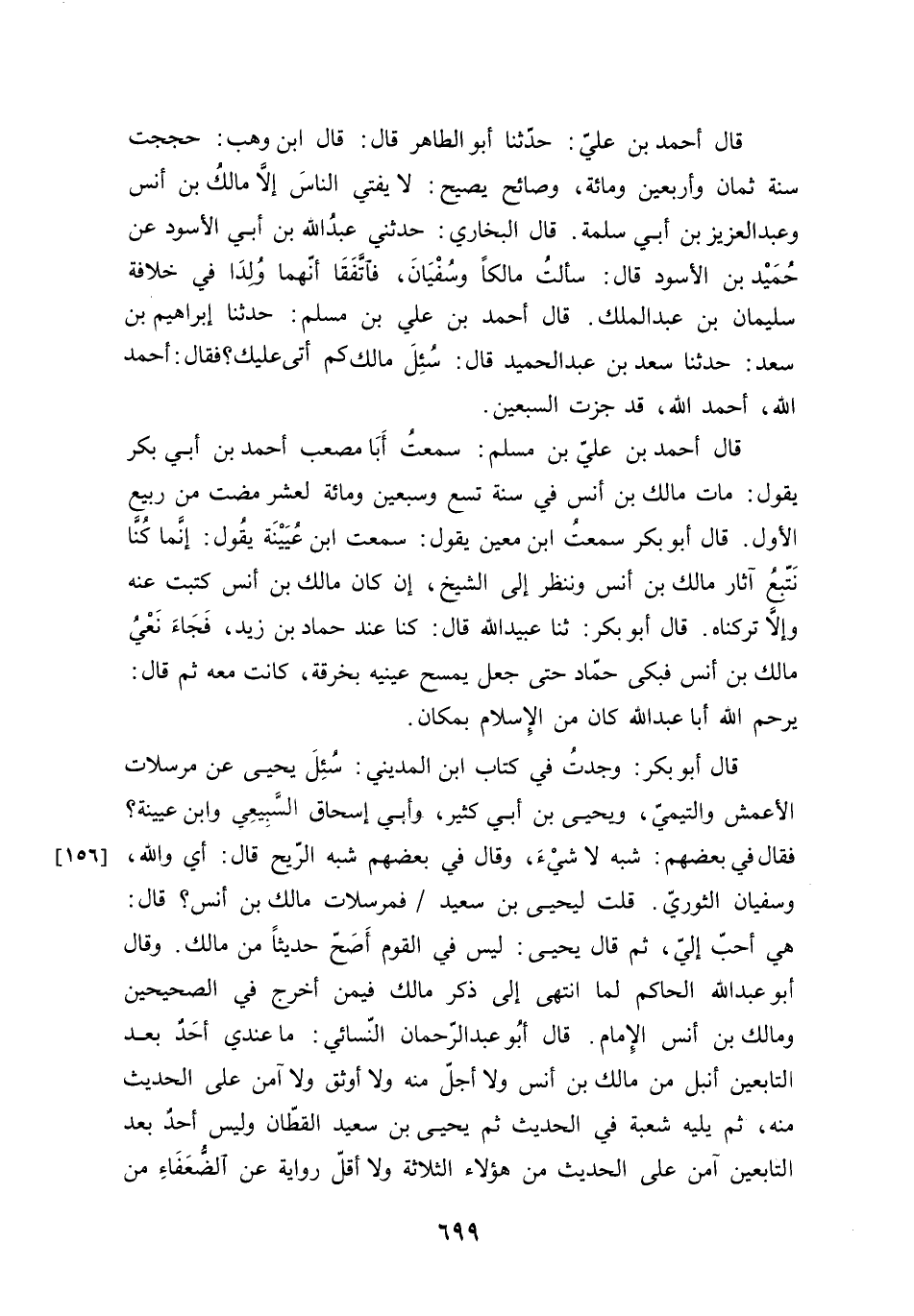 قَالَ أَحْمد بن عَليّ حَدثنَا أَبُو الطَّاهِر قَالَ قَالَ بن وهب حججْت سنة ثَمَان وَأَرْبَعين وَمِائَة وصائح يَصِيح لَا يُفْتِي النَّاس إِلَّا مَالك بن أنس وَعبد الْعَزِيز بن أبي سَلمَة قَالَ البُخَارِيّ حَدثنِي عبد الله بن أبي الْأسود عَن حميد بن الْأسود قَالَ سَأَلت مَالِكًا وسُفْيَان فاتفقا أَنَّهُمَا ولدا فِي خلَافَة سُلَيْمَان بن عبد الْملك قَالَ أَحْمد بن عَليّ بن مُسلم حَدثنَا إِبْرَاهِيم بن سعد حَدثنَا سعد بن عبد الحميد قَالَ سُئِلَ مَالك كم أَتَى عَلَيْك فَقَالَ أَحْمد الله أَحْمد الله قد جزت السّبْعين قَالَ أَحْمد بن عَليّ بن مُسلم سَمِعت أَبَا مُصعب أَحْمد بن أبي بكر يَقُول مَاتَ مَالك بن أنس فِي سنة تسع وَسبعين وَمِائَة لعشر مَضَت من ربيع الأول قَالَ أَبُو بكر سَمِعت بن معِين يَقُول سَمِعت بن عُيَيْنَة يَقُول إِنَّمَا كُنَّا نتبع آثَار مَالك بن أنس وَنَنْظُر إِلَى الشَّيْخ إِن كَانَ مَالك بن أنس كتبت عَنهُ وَإِلَّا تَرَكْنَاهُ قَالَ أَبُو بكر ثَنَا عبيد الله قَالَ كُنَّا عِنْد حَمَّاد بن زيد فجَاء نعي مَالك بن أنس فَبكى حَمَّاد حَتَّى جعل يمسح عَيْنَيْهِ بِخرقَة كَانَت مَعَه ثمَّ قَالَ يرحم الله أَبَا عبد الله كَانَ من الْإِسْلَام بمَكَان قَالَ أَبُو بكر وجدت فِي كتاب بن الْمَدِينِيّ سُئِلَ يحيى عَن مرسلات الْأَعْمَش والتيمي وَيحيى بن أبي كثير وَأبي إِسْحَاق السبيعِي وَابْن عُيَيْنَة فَقَالَ فِي بَعضهم شبه لَا شَيْء وَقَالَ فِي بَعضهم شبه الرّيح قَالَ أَي وَالله وسُفْيَان الثَّوْريّ قلت ليحيى بن سعيد فمرسلات مَالك بن أنس قَالَ هِيَ أحب إِلَيّ ثمَّ قَالَ يحيى لَيْسَ فِي الْقَوْم أصح حَدِيثا من مَالك وَقَالَ أَبُو عبد الله الْحَاكِم لما انْتهى إِلَى ذكر مَالك فِيمَن أخرج فِي الصَّحِيحَيْنِ وَمَالك بن أنس الإِمَام قَالَ أَبُو عبد الرَّحْمَن النَّسَائِيّ مَا عِنْدِي أحد بعد التَّابِعين أنبل من مَالك بن أنس وَلَا أجل مِنْهُ وَلَا أوثق وَلَا آمن على الحَدِيث مِنْهُ ثمَّ يَلِيهِ شُعْبَة فِي الحَدِيث ثمَّ يحيى بن سعيد الْقطَّان وَلَيْسَ أحد بعد التَّابِعين آمن على الحَدِيث من هَؤُلَاءِ الثَّلَاثَة وَلَا أقل رِوَايَة عَن الضُّعَفَاء من