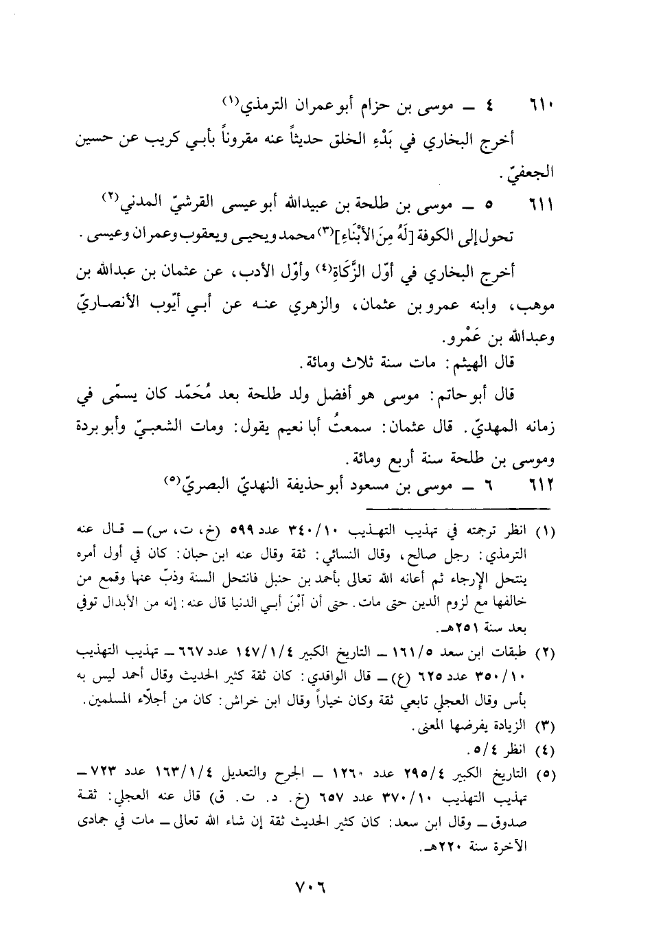 611 - مُوسَى بن طَلْحَة بن عبيد الله أَبُو عِيسَى الْقرشِي الْمدنِي تحول إِلَى الْكُوفَة لَهُ من الْأَبْنَاء مُحَمَّد وَيحيى وَيَعْقُوب وَعمْرَان وَعِيسَى أخرج البُخَارِيّ فِي أول الزَّكَاة وَأول الْأَدَب عَن عُثْمَان بن عبد الله بن موهب وَابْنه عَمْرو بن عُثْمَان وَالزهْرِيّ عَنهُ عَن أبي أَيُّوب الْأنْصَارِيّ وَعبد الله بن عَمْرو قَالَ الْهَيْثَم مَاتَ سنة ثَلَاث وَمِائَة قَالَ أَبُو حَاتِم مُوسَى هُوَ أفضل ولد طَلْحَة بعد مُحَمَّد كَانَ يُسمى فِي زَمَانه الْمهْدي قَالَ عُثْمَان سَمِعت أَبَا نعيم يَقُول وَمَات الشّعبِيّ وَأَبُو بردة ومُوسَى بن طَلْحَة سنة أَربع وَمِائَة