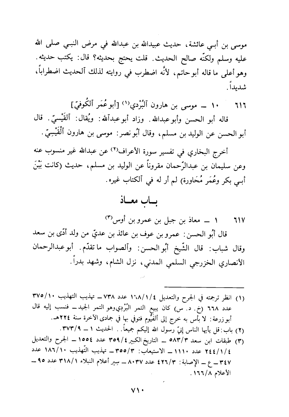 617 - معَاذ بن جبل بن عَمْرو بن أَوْس قَالَ أَبُو الْحسن عَمْرو بن عَوْف بن عَائِذ بن عدي من ولد أدّى بن سعد وَقَالَ شباب قَالَ الشَّيْخ أَبُو الْحسن وَالصَّوَاب مَا تقدم أَبُو عبد الرَّحْمَن الْأنْصَارِيّ الخزرجي السّلمِيّ الْمدنِي نزل الشَّام وَشهد بَدْرًا أخرج البُخَارِيّ فِي آخر اللبَاس ومواضع عَن أنس بن مَالك وَعَمْرو بن مَيْمُون وَالْأسود بن هِلَال عَنهُ عَن النَّبِي صلى الله عَلَيْهِ وَسلم قَالَ عَمْرو بن عَليّ مَاتَ بِنَاحِيَة الْأُرْدُن سنة ثَمَانِي عشرَة وَهُوَ بن ثَلَاث وَثَلَاثِينَ سنة شهد بَدْرًا وَهُوَ بن عشْرين سنة أخرج البُخَارِيّ فِي التَّارِيخ حَدثنَا إِسْمَاعِيل حَدثنِي أخي عَن سُلَيْمَان عَن يحيى بن سعيد قَالَ توفّي معَاذ بن جبل وَهُوَ بن ثَمَان وَعشْرين سنة وَالَّذِي يرفع فِي سنه يَقُول إِحْدَى أَو اثْنَتَيْنِ وَثَلَاثِينَ سنة وَأخرج فِيهِ مُحَمَّد بن يُوسُف أَبُو أَحْمد حَدثنَا عبد الْأَعْلَى بن مسْهر قَالَ مَاتَ معَاذ بن جبل سنة سبع عشرَة فتح بَيت الْمُقَدّس قَالَ أَبُو بكر قَالَ الْمَدَائِنِي مَاتَ فِي طاعون عمواس وَهُوَ بن ثَمَان وَثَلَاثِينَ سنة وَلم يُولد لَهُ قطّ