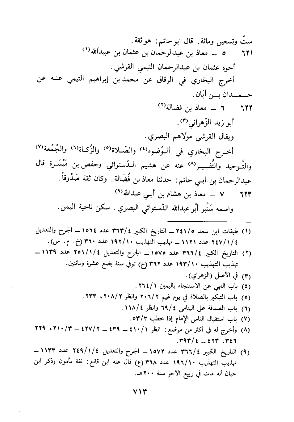 623 - معَاذ بن هِشَام بن أبي عبد الله واسْمه سنبر أَبُو عبد الله الدستوَائي الْبَصْرِيّ سكن نَاحيَة الْيمن أخرج البُخَارِيّ فِي الْعلم وَغير مَوضِع عَن عَليّ بن الْمَدِينِيّ وَإِسْحَاق الْحَنْظَلِي وَبُنْدَار وَعبد الله بن أبي الْأسود عَنهُ عَن أَبِيه قَالَ البُخَارِيّ كَانَ بِالْبَصْرَةِ سنة مِائَتَيْنِ قَالَ أَبُو بكر سُئِلَ يحيى بن معِين عَن معَاذ بن هِشَام فَقَالَ لَيْسَ بِذَاكَ الْقوي وَقَالَ عبد الرَّحْمَن بن أبي حَاتِم أخبرنَا يَعْقُوب بن إِسْحَاق الْهَرَوِيّ أخبرنَا عُثْمَان بن سعيد الدَّارمِيّ قَالَ قلت ليحيى بن معِين معَاذ يَعْنِي بن هِشَام أثبت فِي شُعْبَة أَو غنْدر فَقَالَ ثِقَة ثِقَة