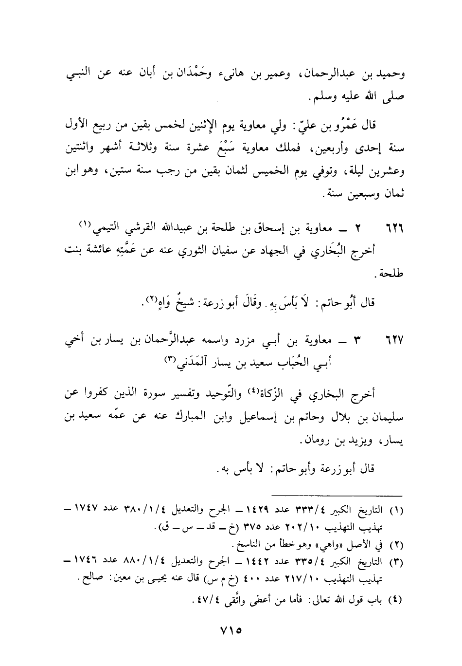 626 - مُعَاوِيَة بن إِسْحَاق بن طَلْحَة بن عبيد الله الْقرشِي التَّيْمِيّ أخرج البُخَارِيّ فِي الْجِهَاد عَن سُفْيَان الثَّوْريّ عَنهُ عَن عمته عَائِشَة بنت طَلْحَة قَالَ أَبُو حَاتِم لَا بَأْس بِهِ وَقَالَ أَبُو زرْعَة شيخ واه
