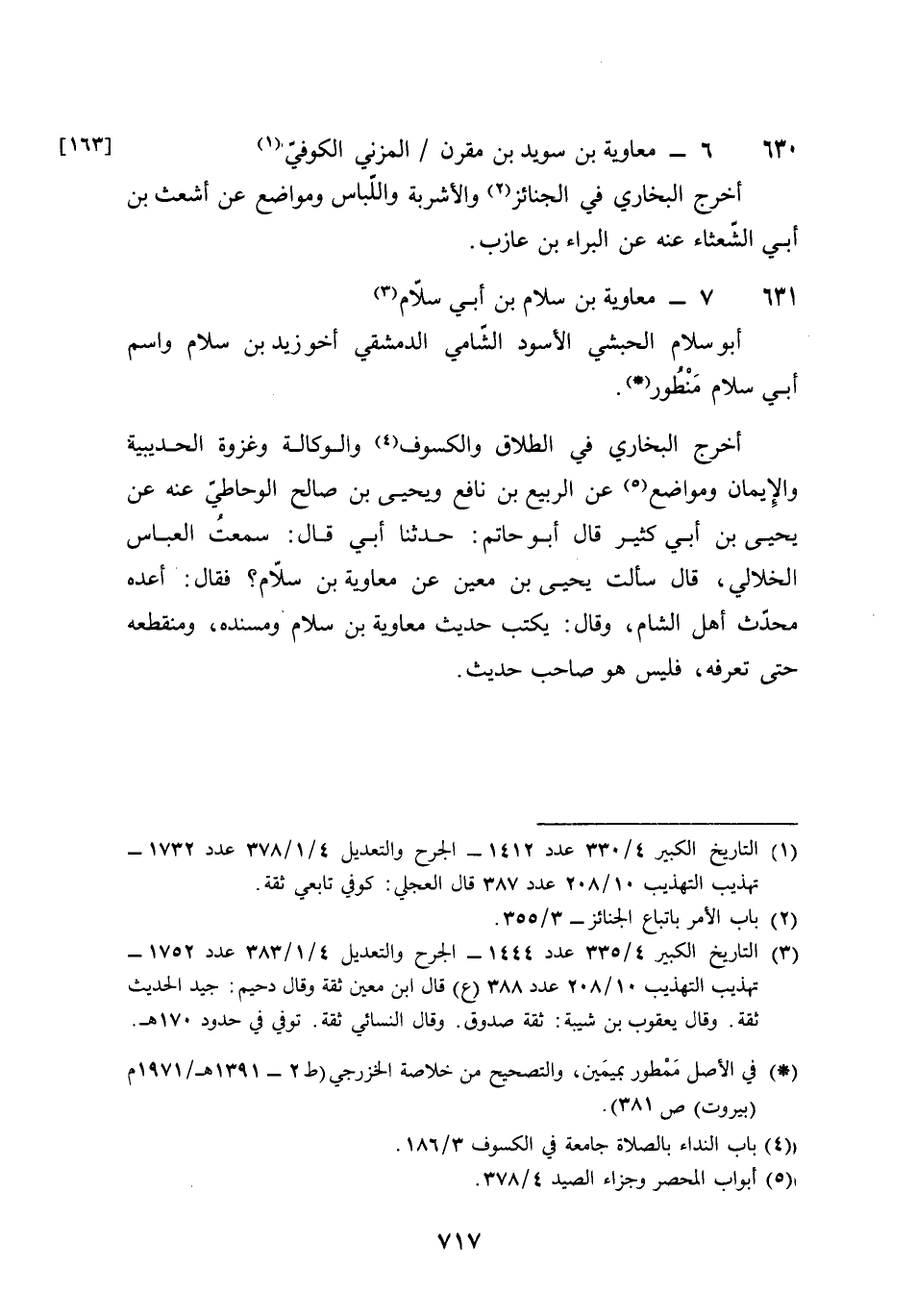 631 - مُعَاوِيَة بن سَلام بن أبي سَلام أَبُو سَلام الحبشي الْأسود الشَّامي الدِّمَشْقِي أَخُو زيد بن سَلام وَاسم أبي سَلام منطور أخرج البُخَارِيّ فِي الطَّلَاق والكسوف وَالْوكَالَة وغزوة الْحُدَيْبِيَة وَالْإِيمَان ومواضع عَن الرّبيع بن نَافِع وَيحيى بن صَالح الوحاطي عَنهُ عَن يحيى بن أبي كثير قَالَ أَبُو حَاتِم حَدثنَا أبي قَالَ سَمِعت الْعَبَّاس الخلالي قَالَ سَأَلت يحيى بن معِين عَن مُعَاوِيَة بن سَلام فَقَالَ أعده مُحدث أهل الشَّام وَقَالَ يكْتب حَدِيث مُعَاوِيَة بن سَلام وَمُسْنَده ومنقطعه حَتَّى تعرفه فَلَيْسَ هُوَ صَاحب حَدِيث