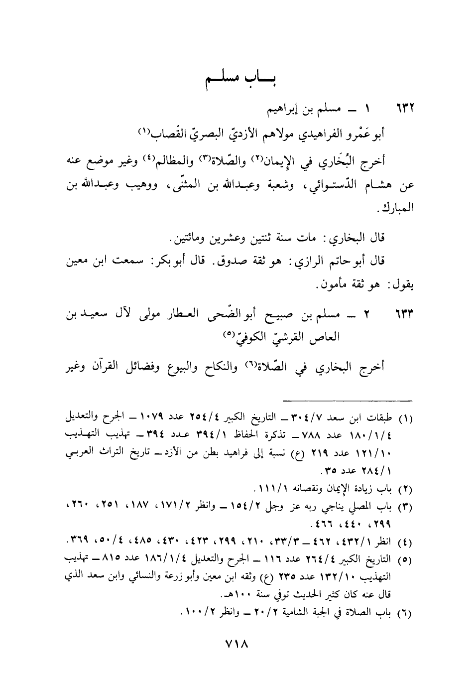632 - مُسلم بن إِبْرَاهِيم أَبُو عَمْرو الفراهيدي مَوْلَاهُم الْأَزْدِيّ الْبَصْرِيّ القصاب أخرج البُخَارِيّ فِي الْإِيمَان وَالصَّلَاة والمظالم وَغير مَوضِع عَنهُ عَن هِشَام الدستوَائي وَشعْبَة وَعبد الله بن الْمثنى ووهيب وَعبد الله بن الْمُبَارك قَالَ البُخَارِيّ مَاتَ سنة ثِنْتَيْنِ وَعشْرين وَمِائَتَيْنِ قَالَ أَبُو حَاتِم الرَّازِيّ هُوَ ثِقَة صَدُوق قَالَ أَبُو بكر سَمِعت بن معِين يَقُول هُوَ ثِقَة مَأْمُون