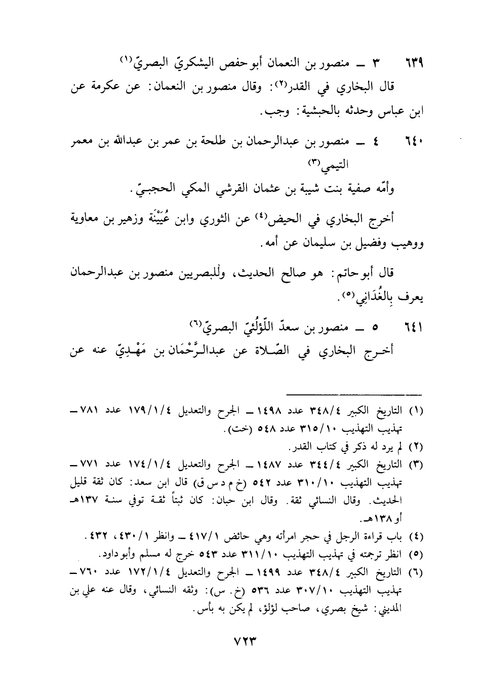 640 - مَنْصُور بن عبد الرَّحْمَن بن طَلْحَة بن عمر بن عبد الله بن معمر التَّيْمِيّ وَأمه صَفِيَّة بنت شيبَة بن عُثْمَان الْقرشِي الْمَكِّيّ الحَجبي أخرج البُخَارِيّ فِي الْحيض عَن الثَّوْريّ وَابْن عُيَيْنَة وَزُهَيْر بن مُعَاوِيَة ووهيب وفضيل بن سُلَيْمَان عَن أمه قَالَ أَبُو حَاتِم هُوَ صَالح الحَدِيث وللبصريين مَنْصُور بن عبد الرَّحْمَن يعرف بالغداني